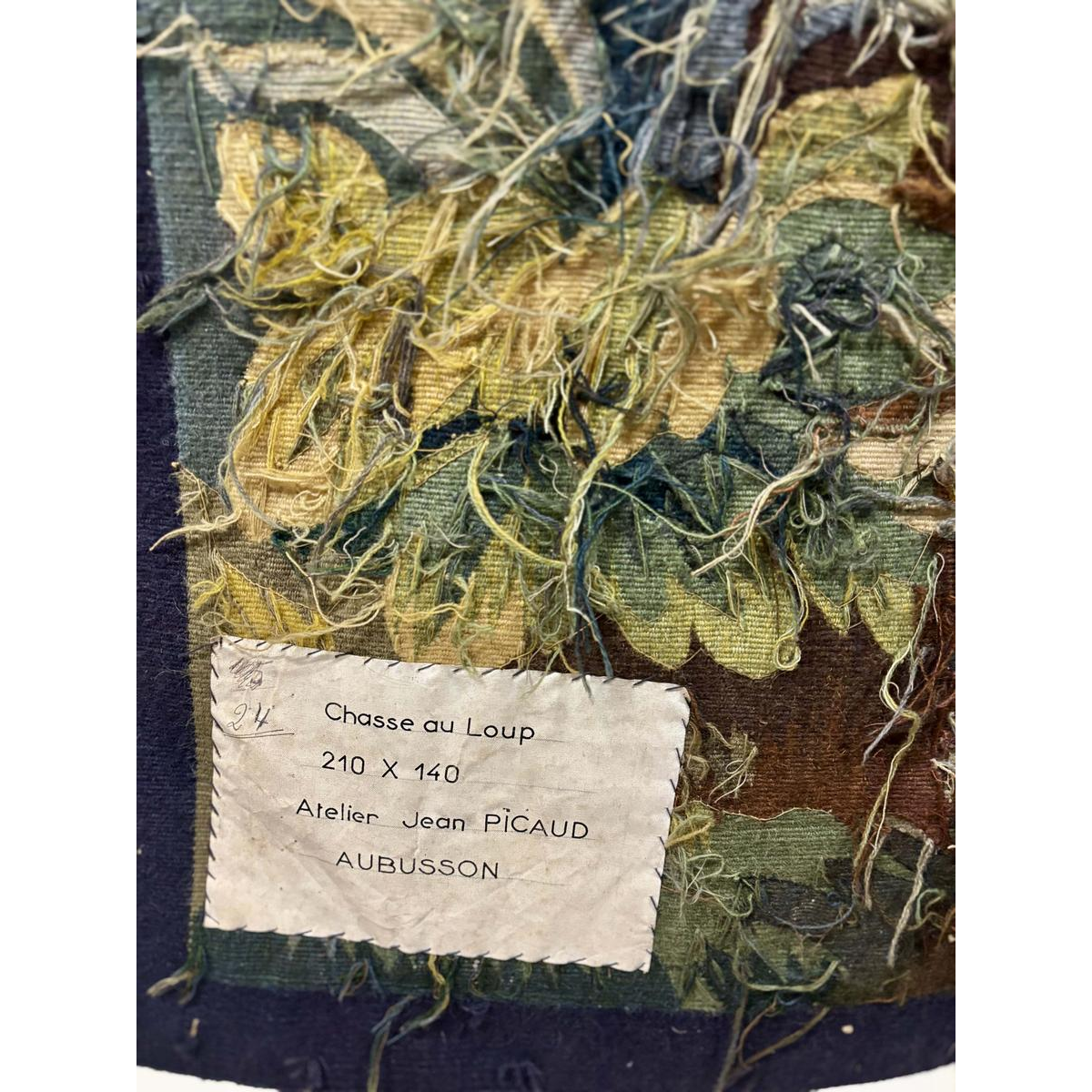 Superb hand-woven tapestry from Aubusson, from the Jean Picaud workshop, depicting a wolf hunt in a wooded landscape in the style of great classical verdure tapestries.