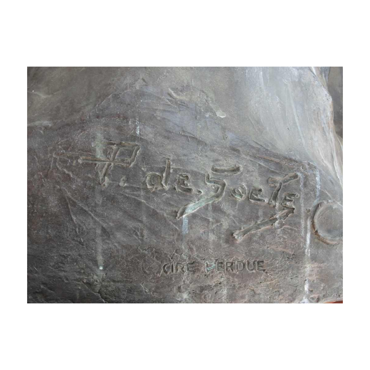 important bronze of the lawyer Jules Destrée is a Belgian politician, doctor of law born in Marcinelle on August 21, 1863 and died in Brussels on January 2, 1936. Bourgeois humanist, the trials following the strikes of 1886 will determine his commitment to the Belgian Workers' Party, the ancestor of the Socialist Party. Pierre de Soete was orphaned at the age of fourteen. He enrolled at the Molenbeek Drawing Academy while learning about self-taught modeling. He apprenticed at the Compagnie des Bronzes and met sculptors, notably Julien Dillens, Constantin Meunier and even Jef Lambeaux.