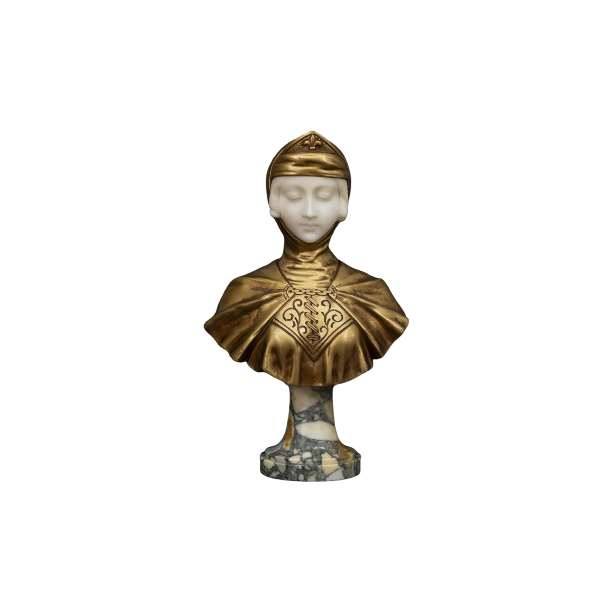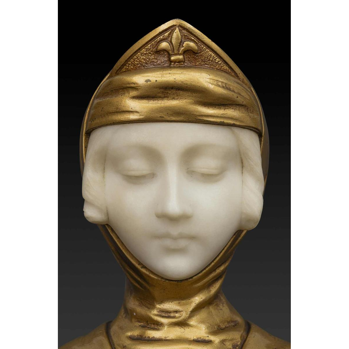 This bust sensitively embodies Joan of Arc's heroic spirit in an artistic blend of alabaster and gilded bronze.