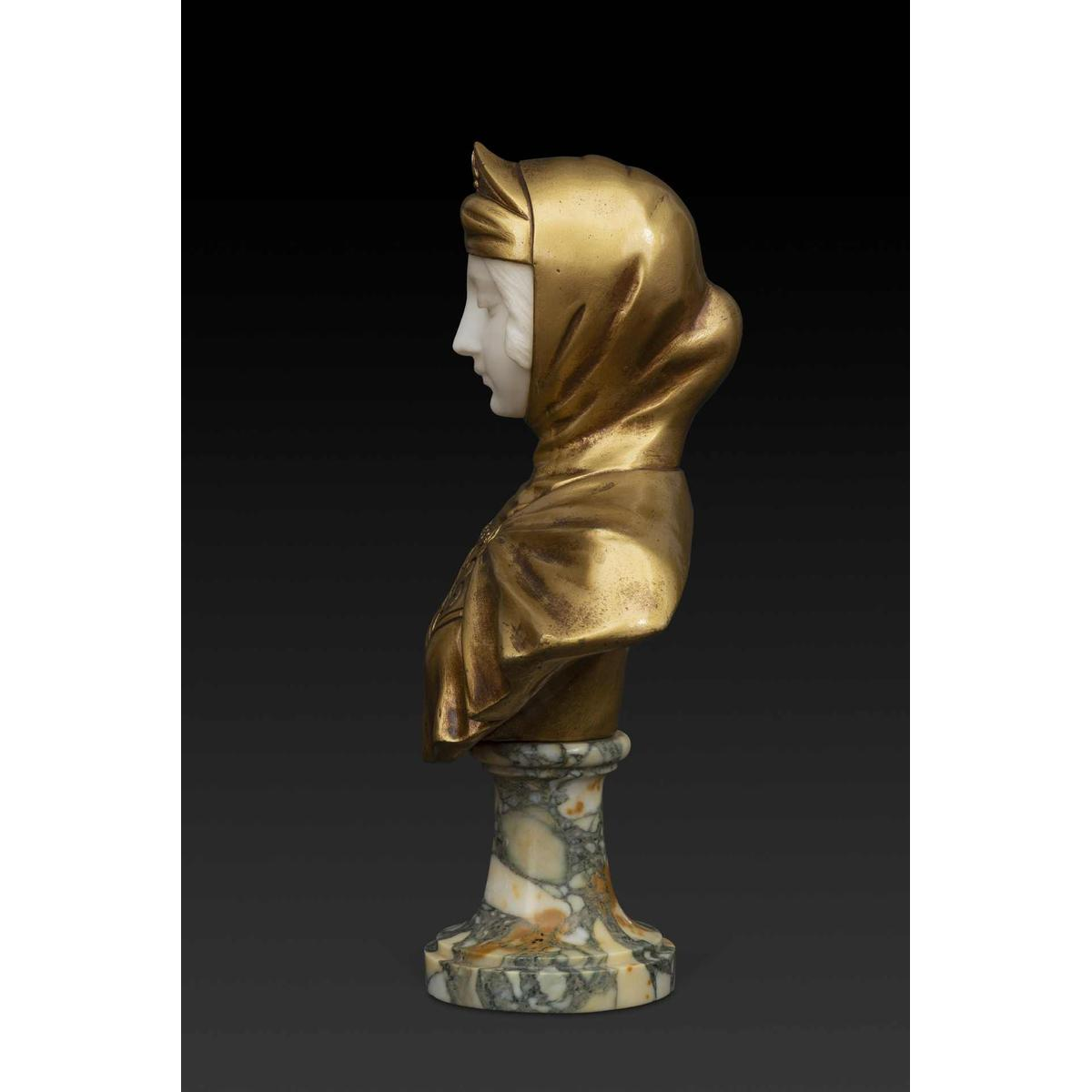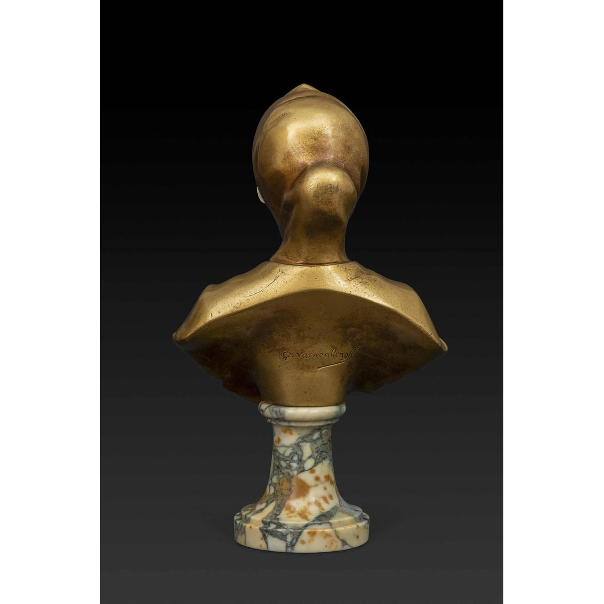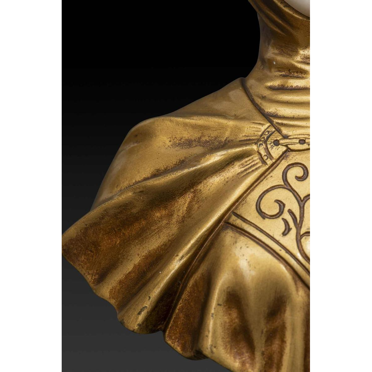 The alabaster and gilded bronze bust of Joan of Arc by Gustave Van Vaerenbergh is a precise and delicate representation of the historical figure.