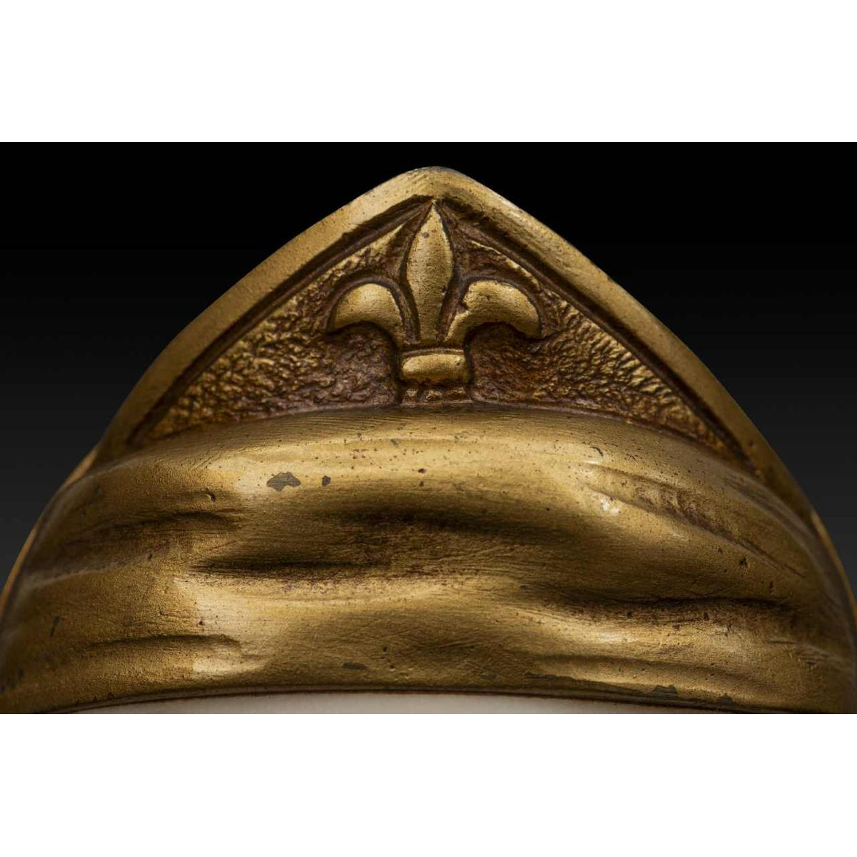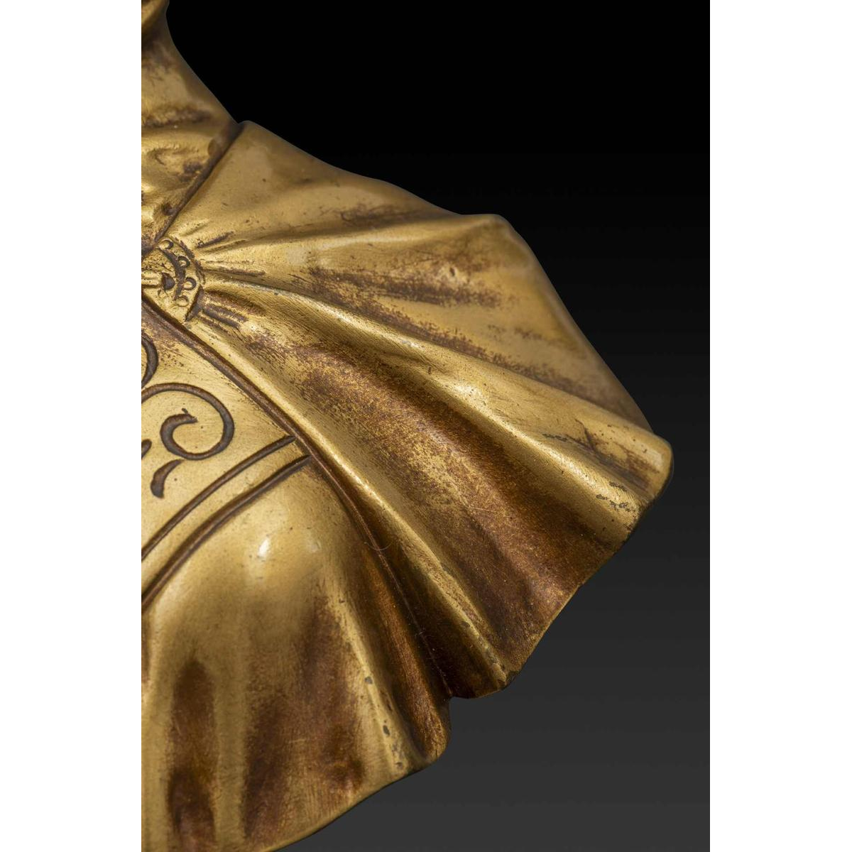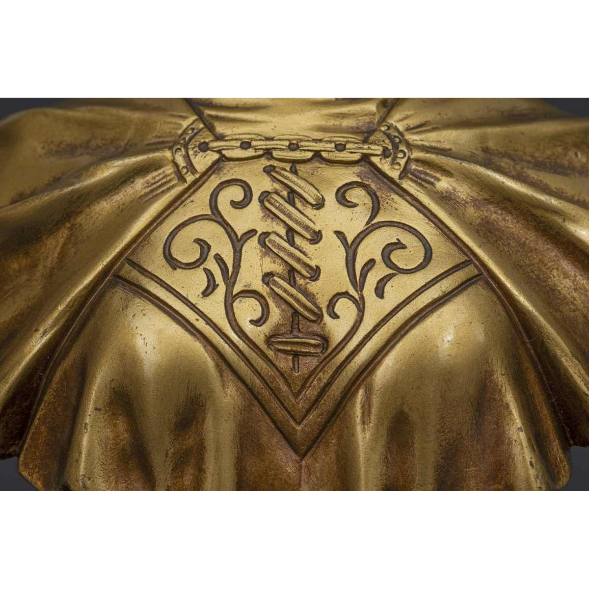 The alabaster and gilded bronze bust of Joan of Arc by Gustave Van Vaerenbergh is a precise and delicate representation of the historical figure.