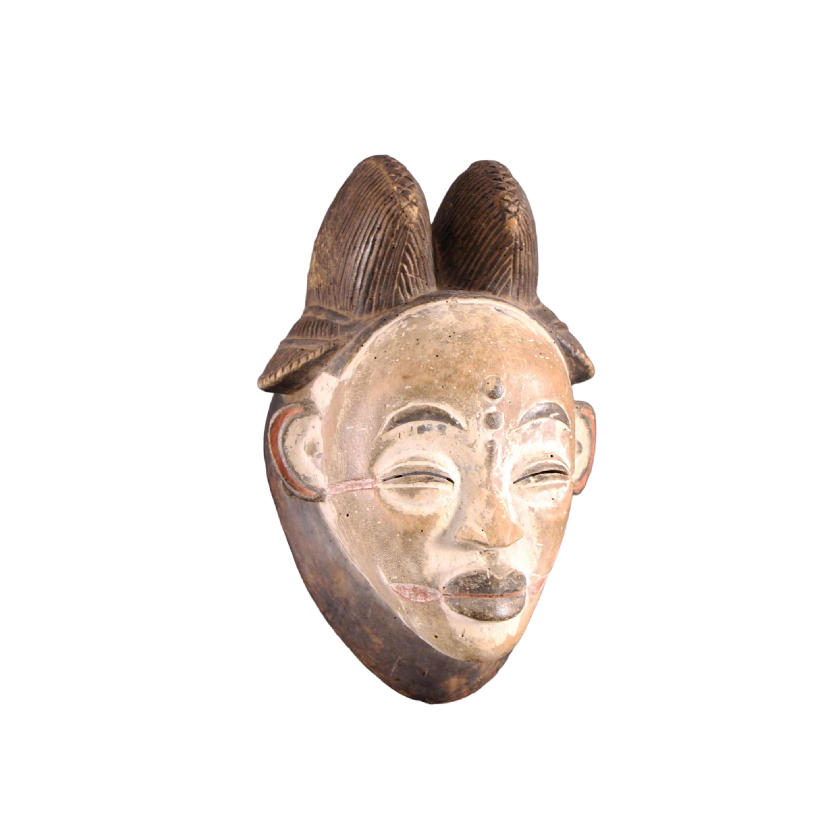 The white masks of Gabon, called itengi (plural bitengi), were linked to various secret Gabonese societies, such as the Bwiti, the Bwete and the Mwiri, the latter meaning 'to lead'. All Punu men belonged to the Mwiri, a society with several levels of initiation, whose emblem was the caiman, explaining for some the saurian scales motif. These powerful secret societies, which also had a judicial role, included several dances, such as the leopard dance, Esomba, Mukuyi and Okuyi. The latter, an acrobatic dance on stilts, was the most widespread. In some villages, the Okuyi was accompanied at dawn or dusk by songs in an esoteric language accessible only to the initiated. (Sources: "Punu", L. Perrois and C. Grand-Dufay; "Masques du Gabon", published by Sillages).