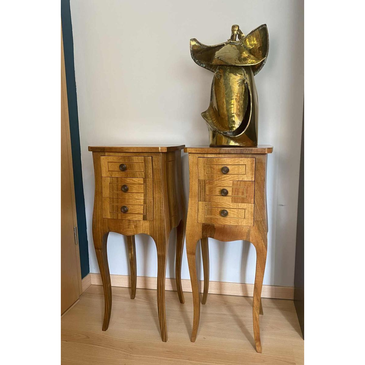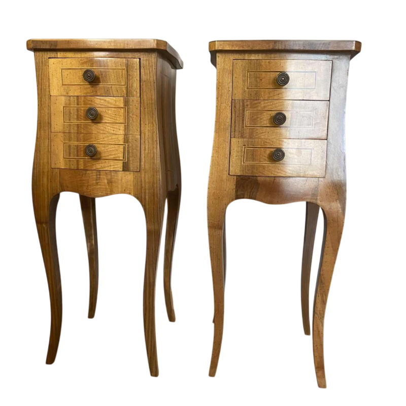 Square in shape, with slightly scalloped edges and three drawers at the front, they stand on delicately curved legs and are made of solid wood, repolished and in perfect condition. All four sides are polished and made to be visible. All sides feature a fillet of darker wood inlay.