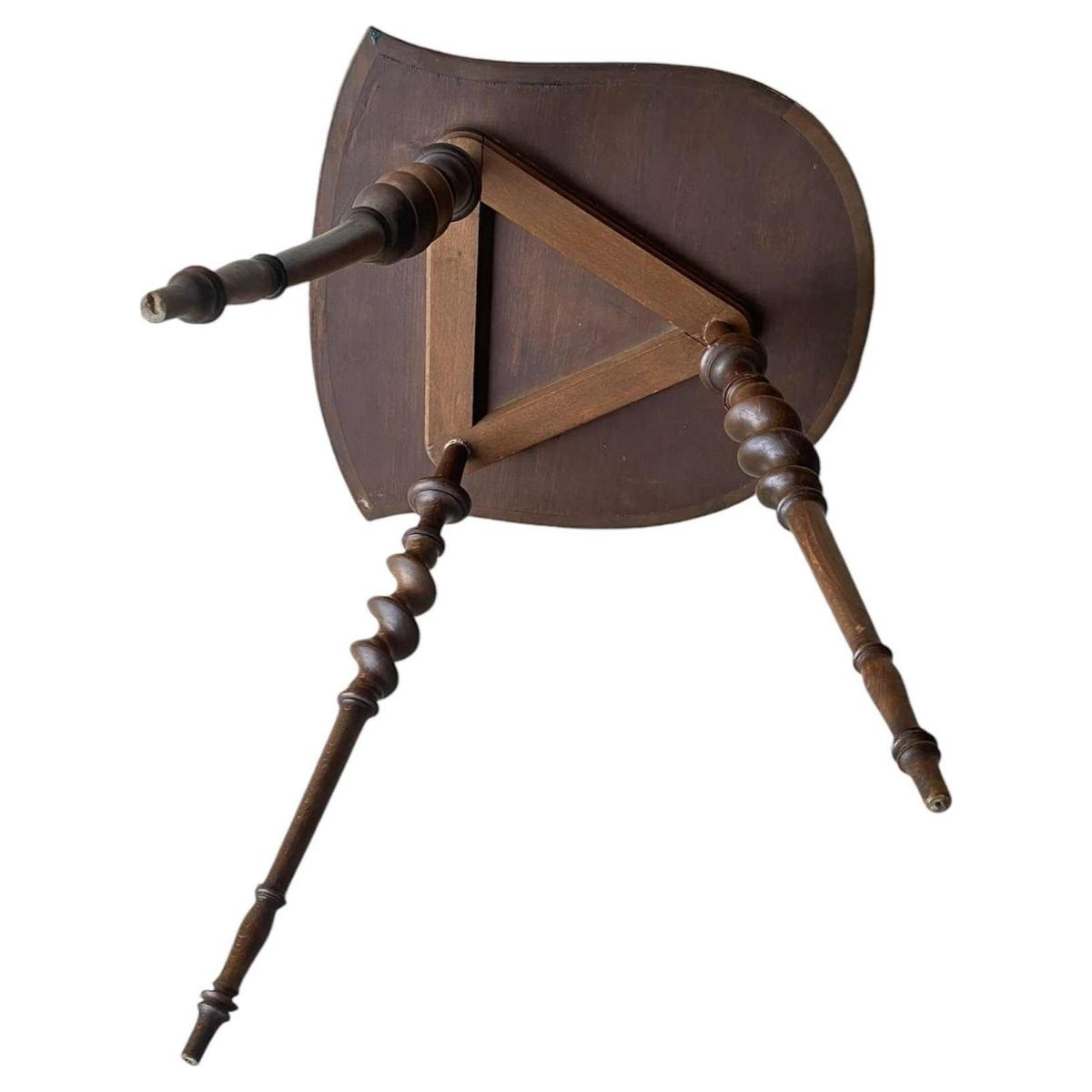 Emile Gallé Table guéridon with escutcheon-shaped top with inlaid decoration of figures spinning wool and inscribed 'L'Heureux Temps', resting on three partly twisted legs, dimensions 73x57x61 cm. Two legs are unscrewed, but the third needs restoration as it is glued. This vintage/antique item may show some wear, such as scratches and other signs of use.