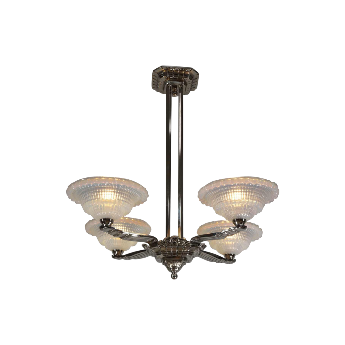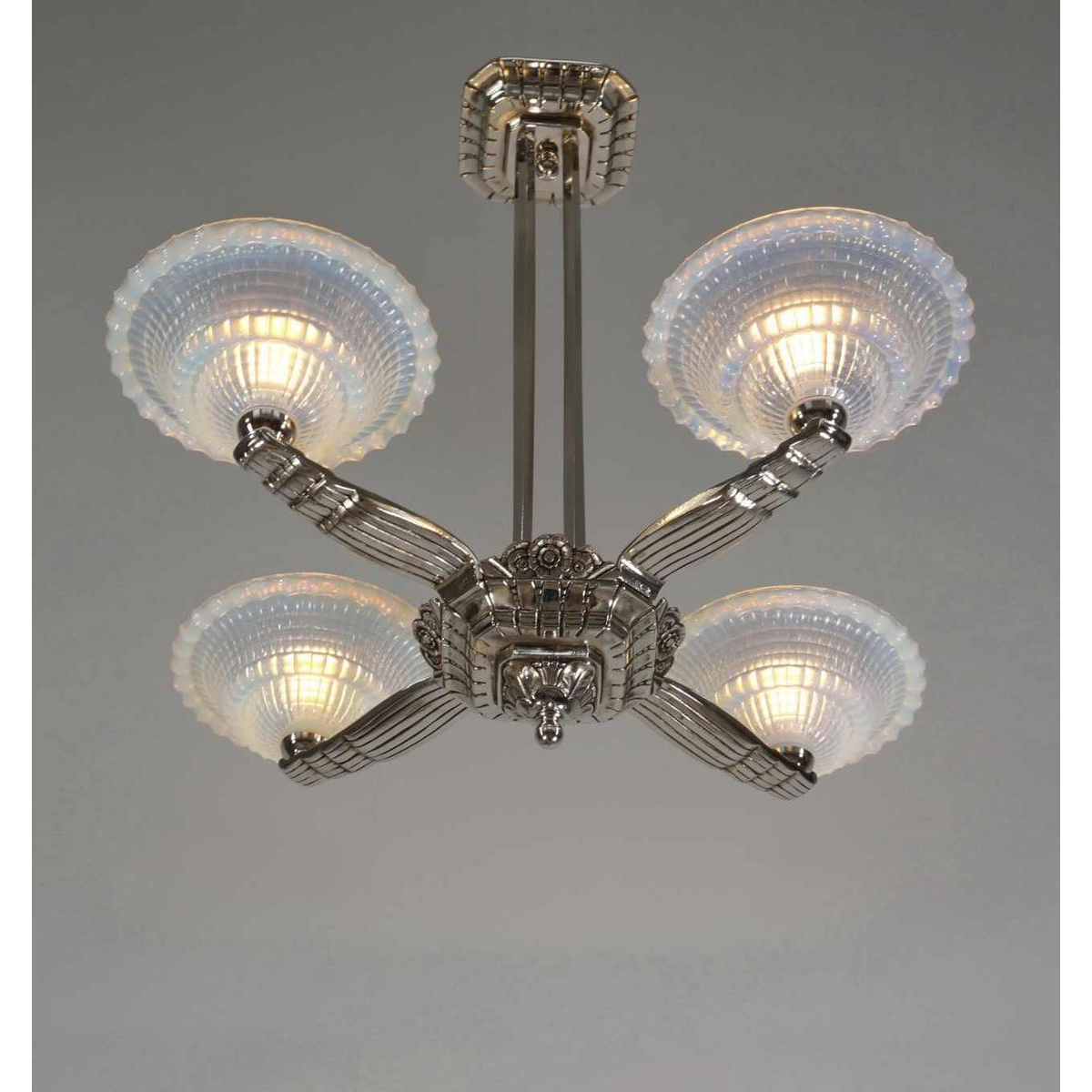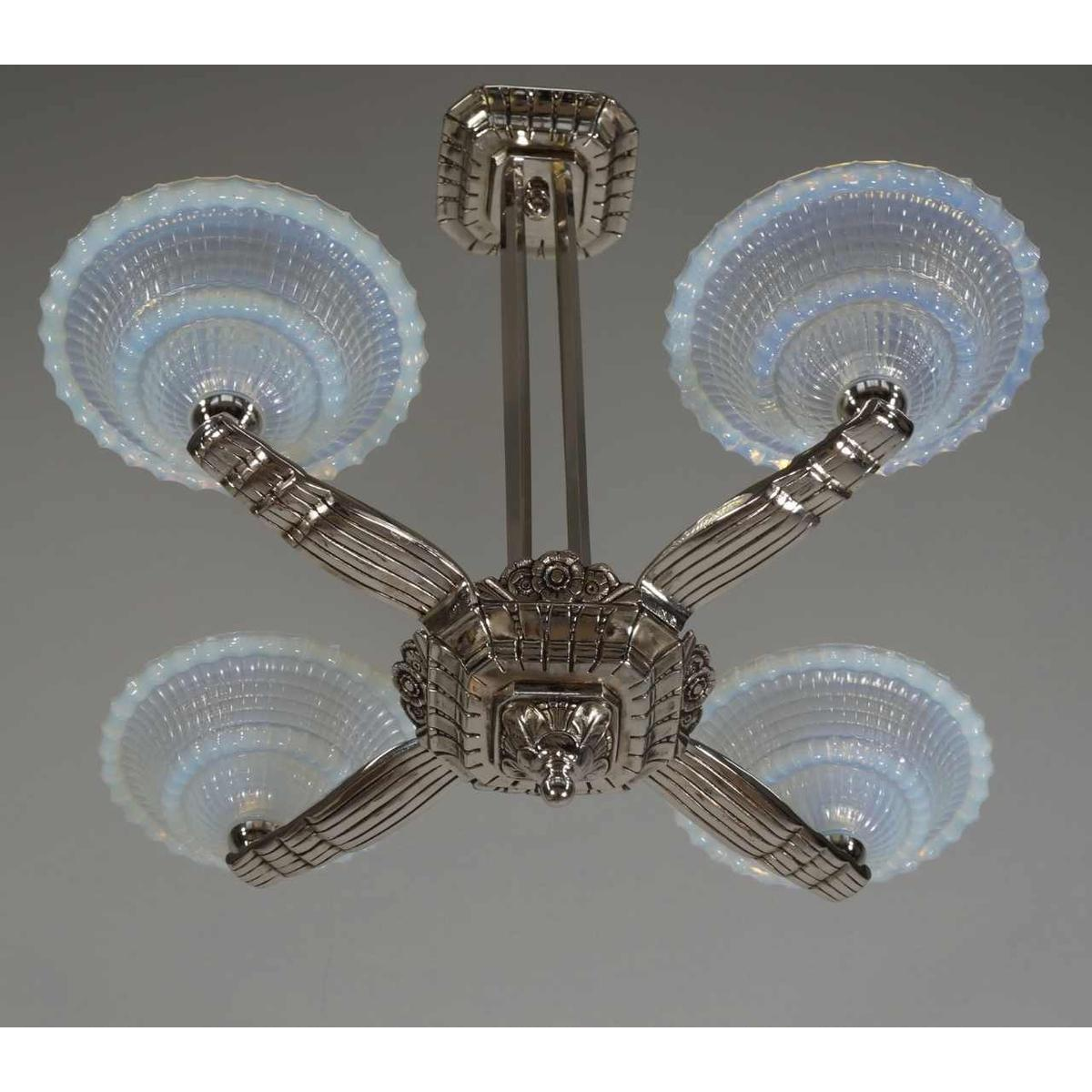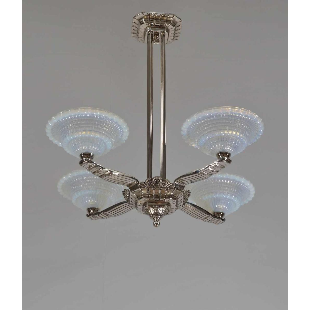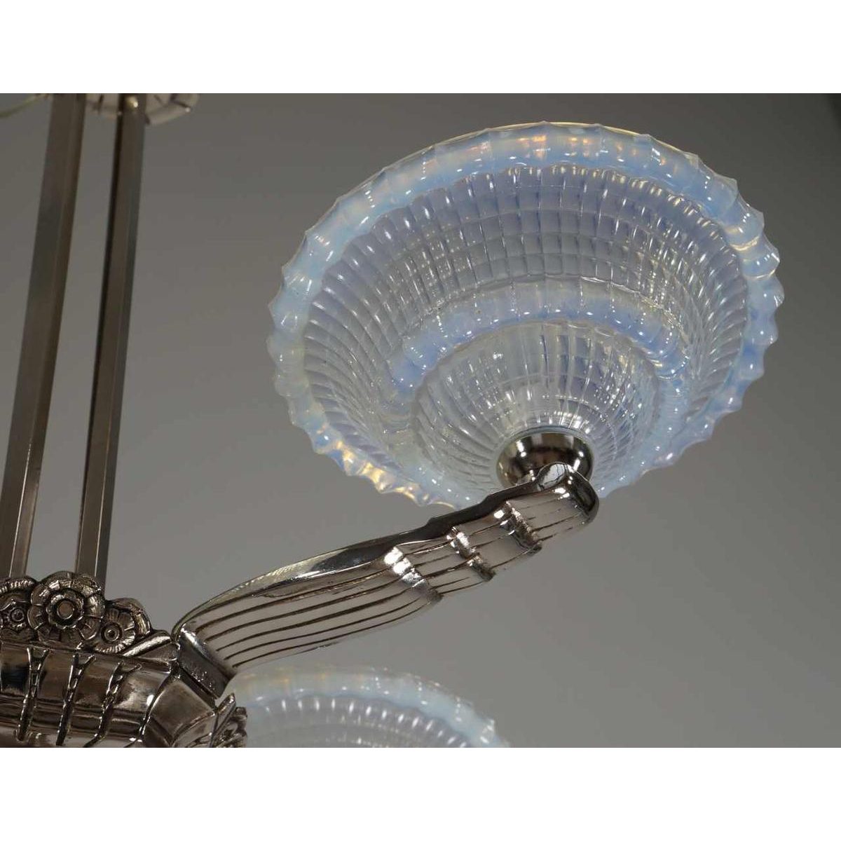 A nice 1930-35 French art deco chandelier in nickel plated bronze and opalescent Ezan shades in bluish semi-crystal. In the late 30's opalescent shades became in fashion. They show beautiful tones of milky blue or warm amber depending whether light falls on it or shines through. The chandelier was designed by or for Pierre Laval. A company in Lyon during the interbellum. Initially an import company of Bohemian glasses they expended selling chandeliers and lamps in modern art déco style. An almost identical chandelier is represented in one of my old Pierre Laval catalogs. Catalogs by the way that show that besides bohemian shades Laval frequently used Muler freres and Gauthier shades for his chandelier fixtures.