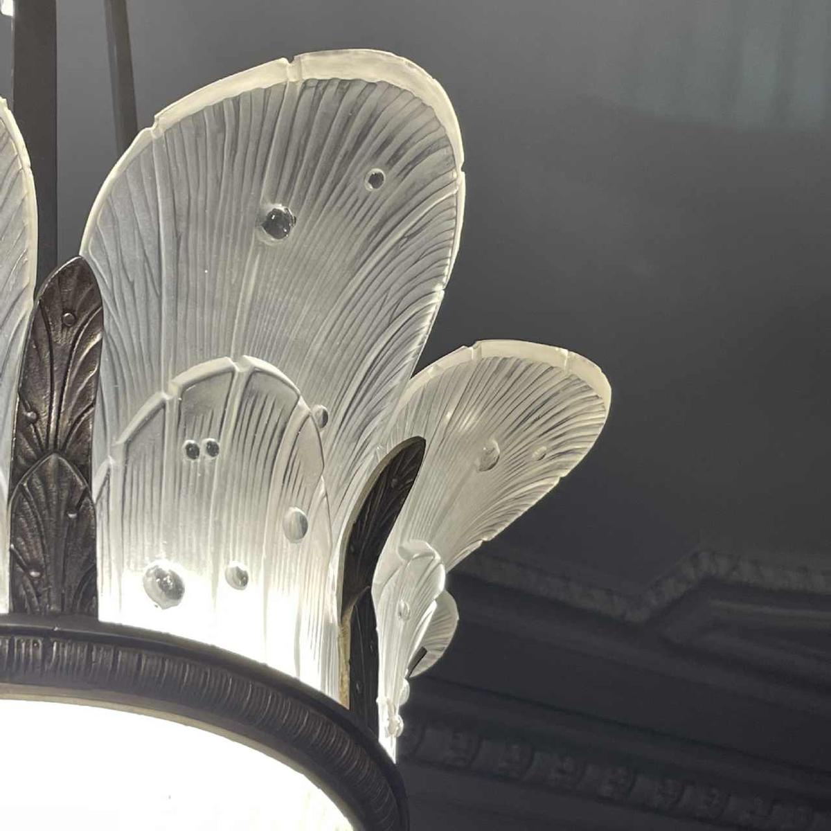 The structure is composed of a very detailed nickel-plated bronze frame and rose, 8 plates and a sandblasted glass dome, attributed to Hettier & Vincent, unsigned.
