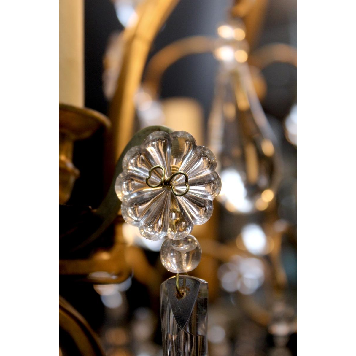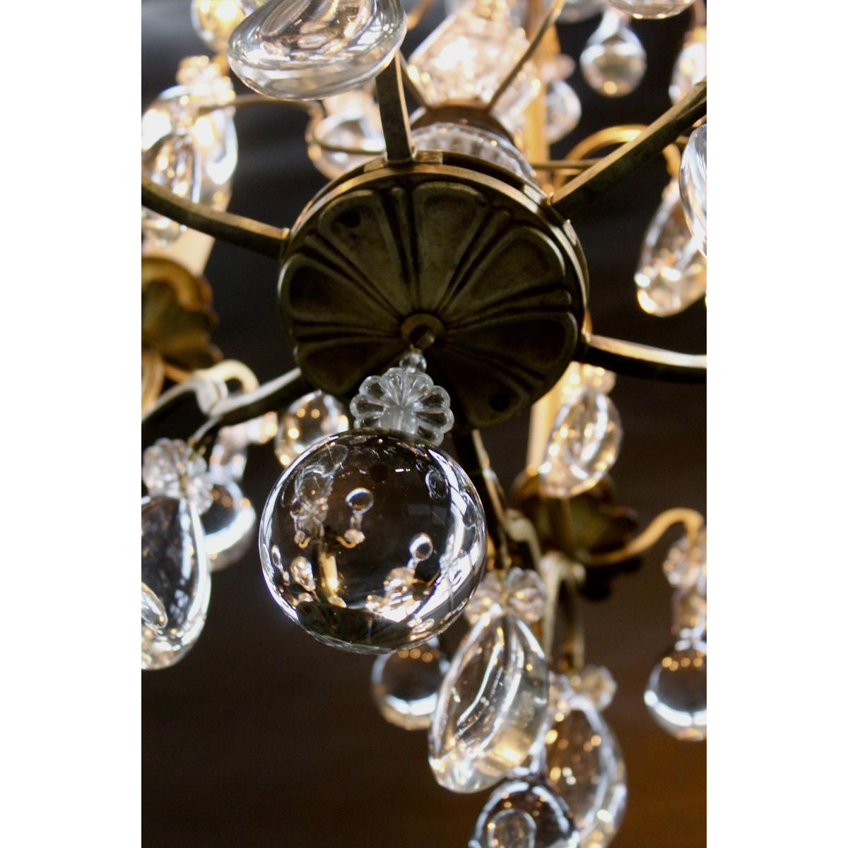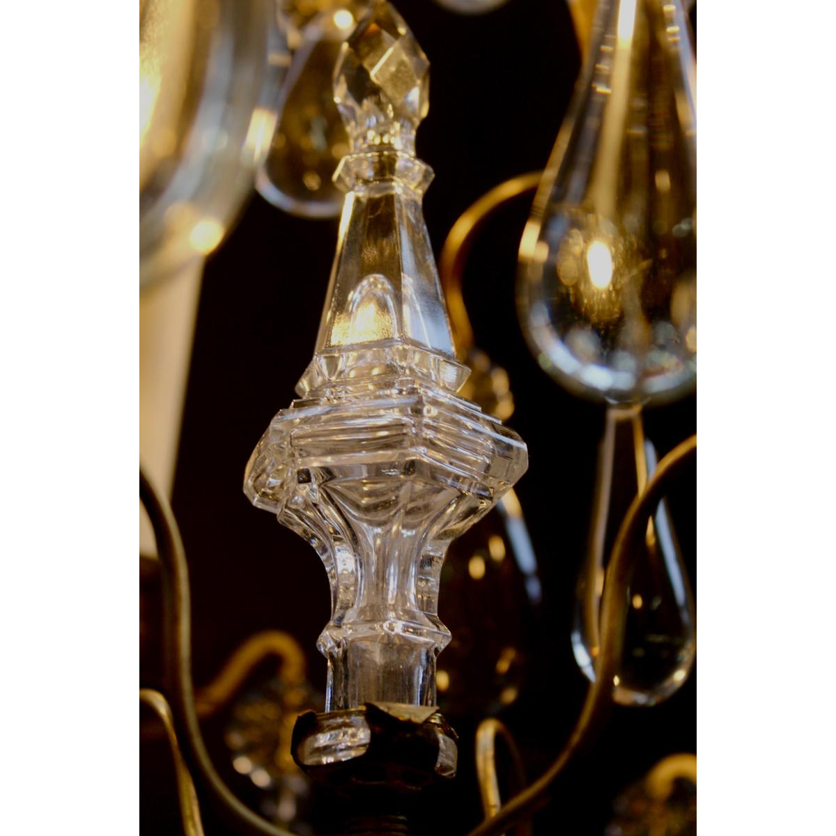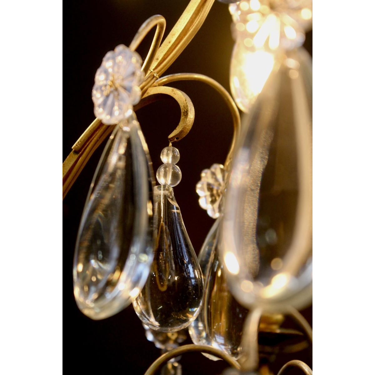 Six light arms, teardrop-shaped and smooth pear-shaped pendants, adorned with rosettes tied by a brass butterfly.