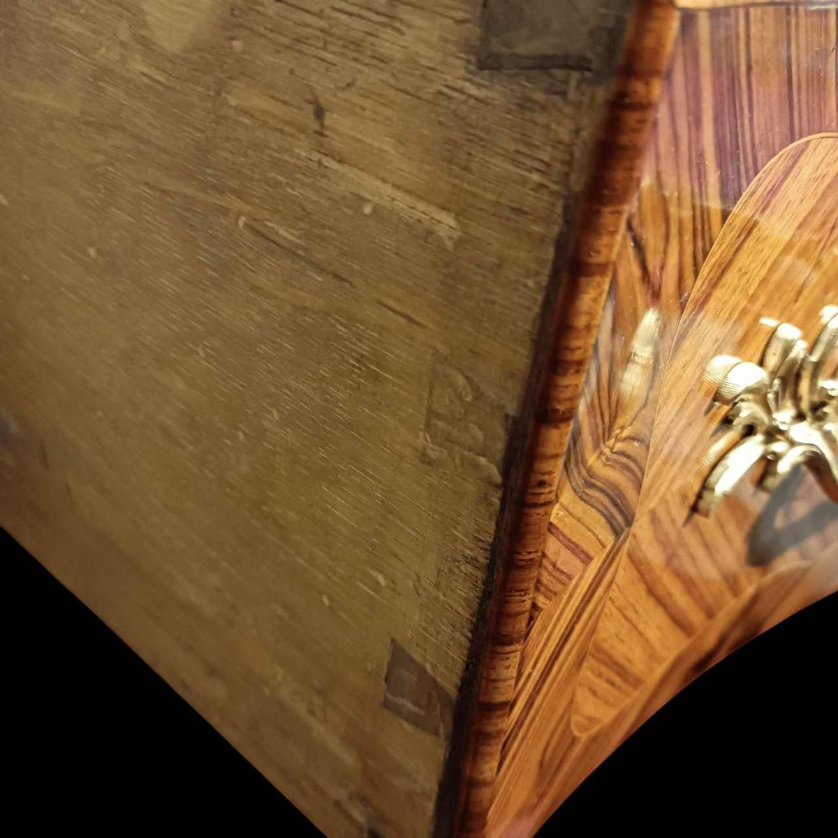 Assembled with dovetail joints and pegs, in light veneer wood (rosewood and palisander), with three drawers in two rows, curved on three sides, decorated with gilded bronze fittings, and a white veined marble top with mouldings.