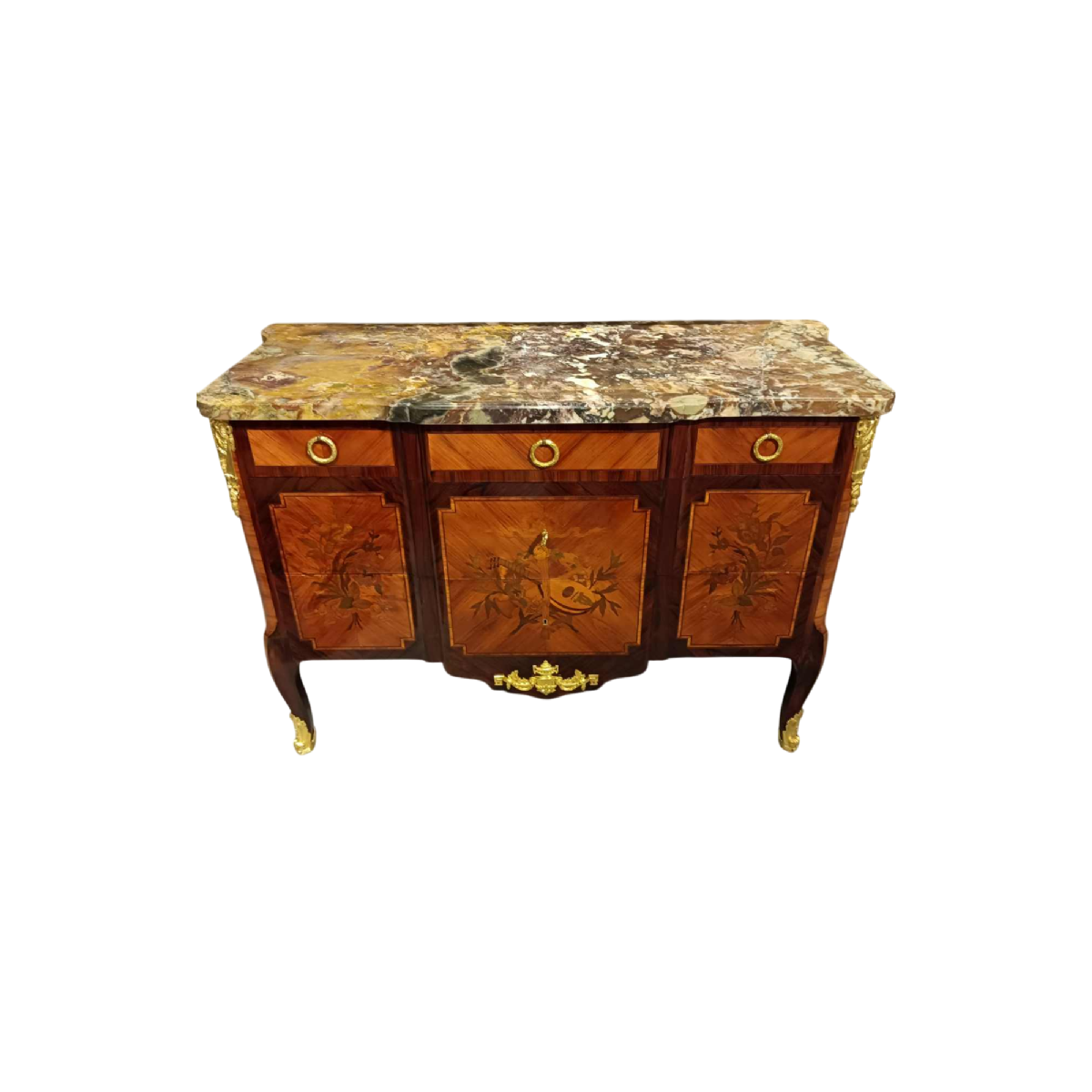 Superb large chest of drawers with central projection, in veneered wood (rosewood and violetwood) with floral and attribute marquetry, 5 drawers on 3 rows. Chased bronze and gilded ornamentation, top in Brèche Vendôme marble, stamped G. LAVIGNE . Stamped varnish. Dimensions : 130x58 cm , height : 88 cm.