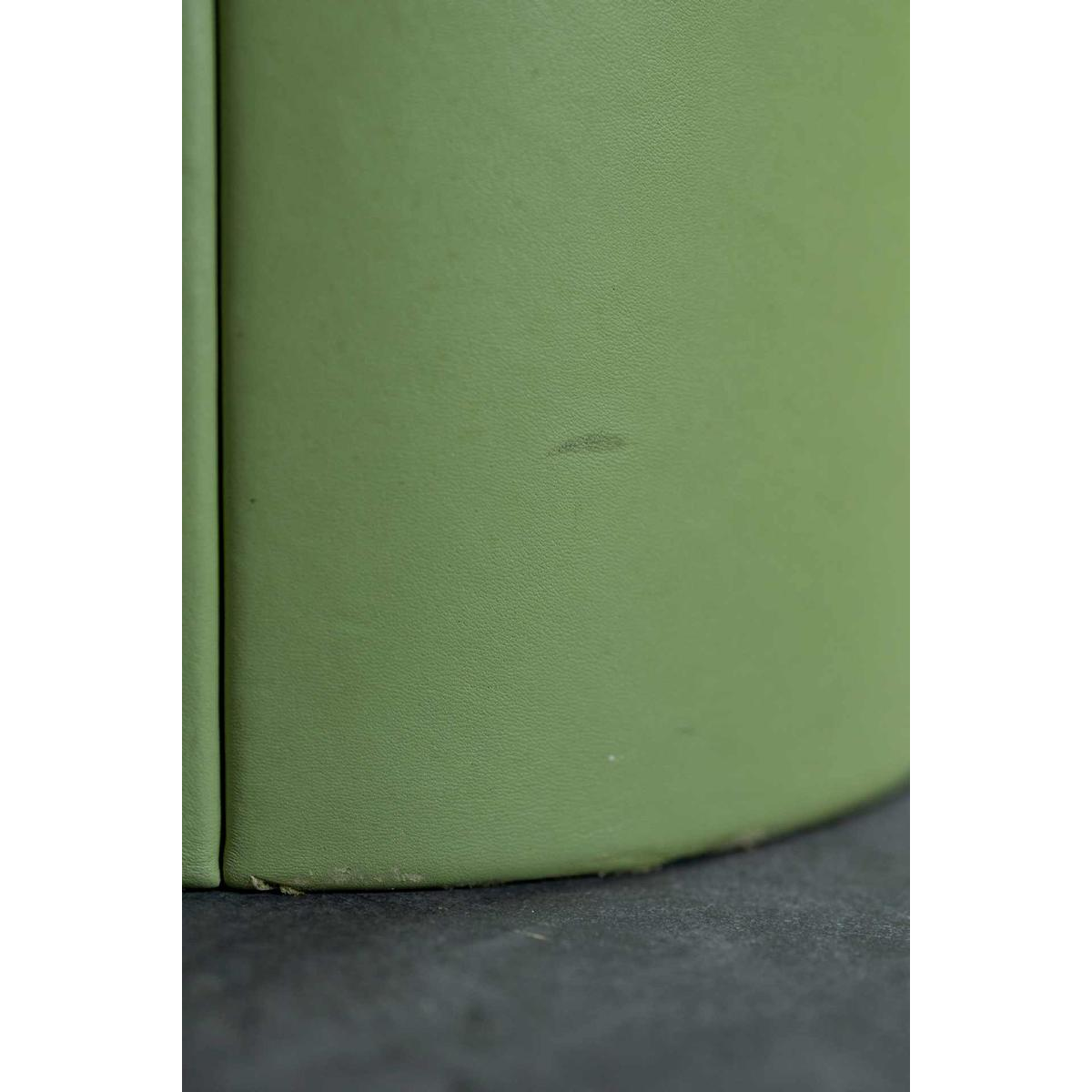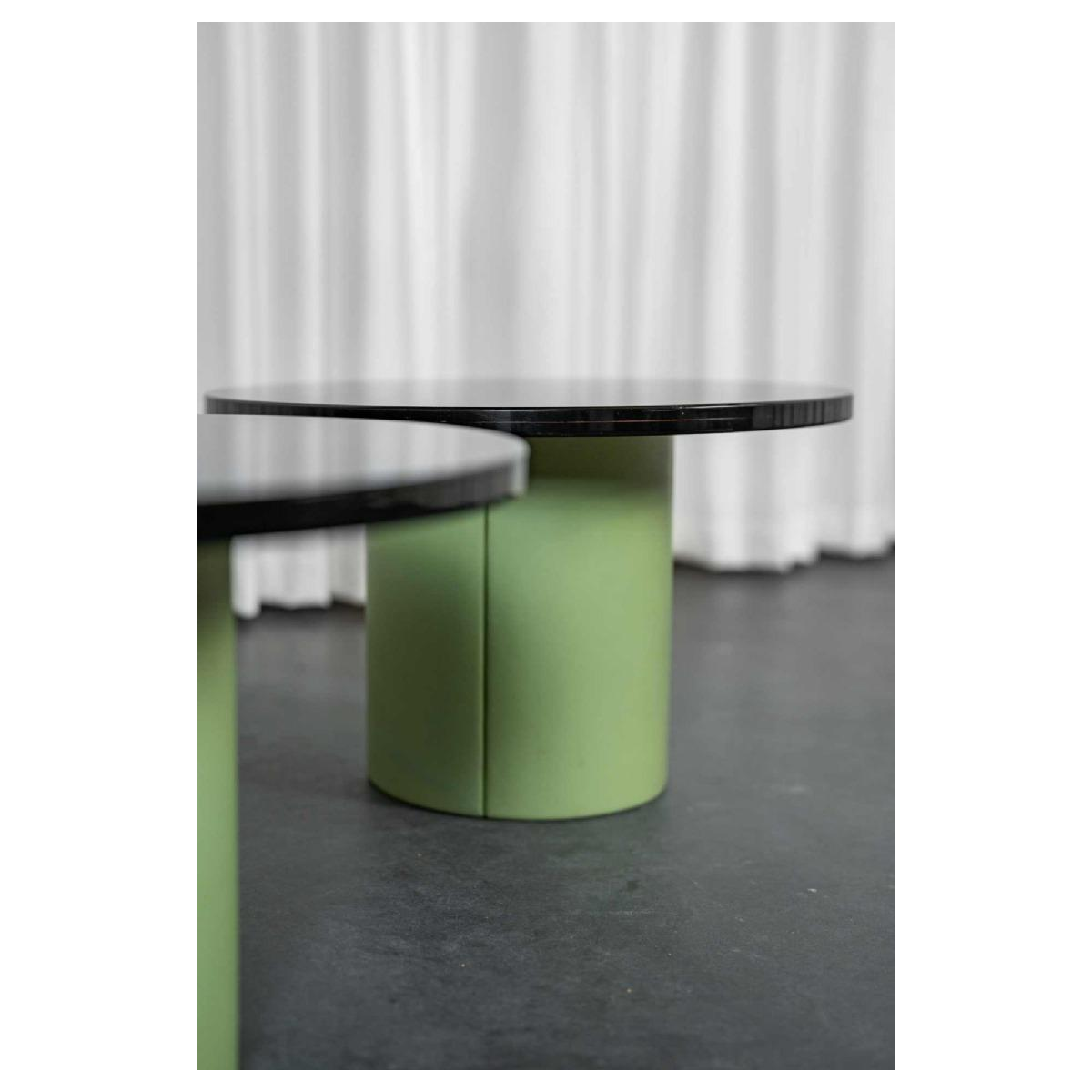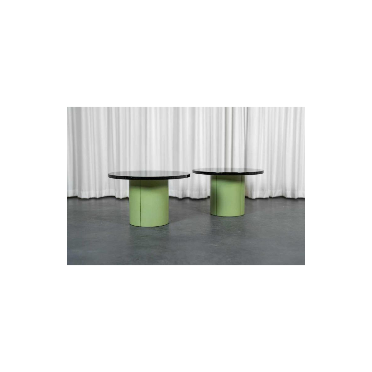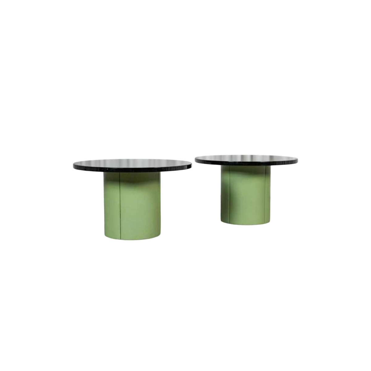Set of 2 coffee tables featuring a central barrel upholstered in matcha green leather and a thick smoked plexiglass top.