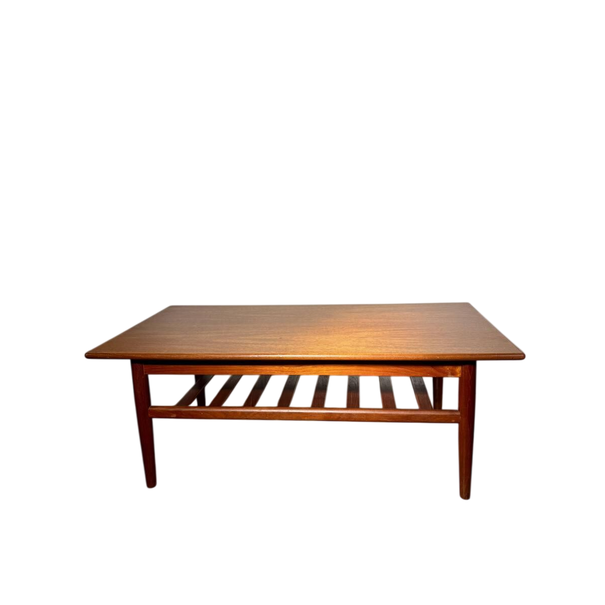 A beautiful rectangular teak coffee table, emblematic of 1960s Scandinavian design, produced by the renowned Danish manufacturer Trioh. This piece is distinguished by the elegance of its lines and the quality of its finish. It features a top with gently curved edges and a slatted shelf (magazine rack) at the bottom, offering functional storage while highlighting the airy graphic design of the structure. The tapered legs, typical of Danish modernism, lend a great visual lightness to the whole. The table bears the original "Trioh - Made in Denmark" stamp under the top, guaranteeing its authenticity and value on the art market. Excellent condition. The teak has a deep and warm honey patina. The structure is perfectly stable.