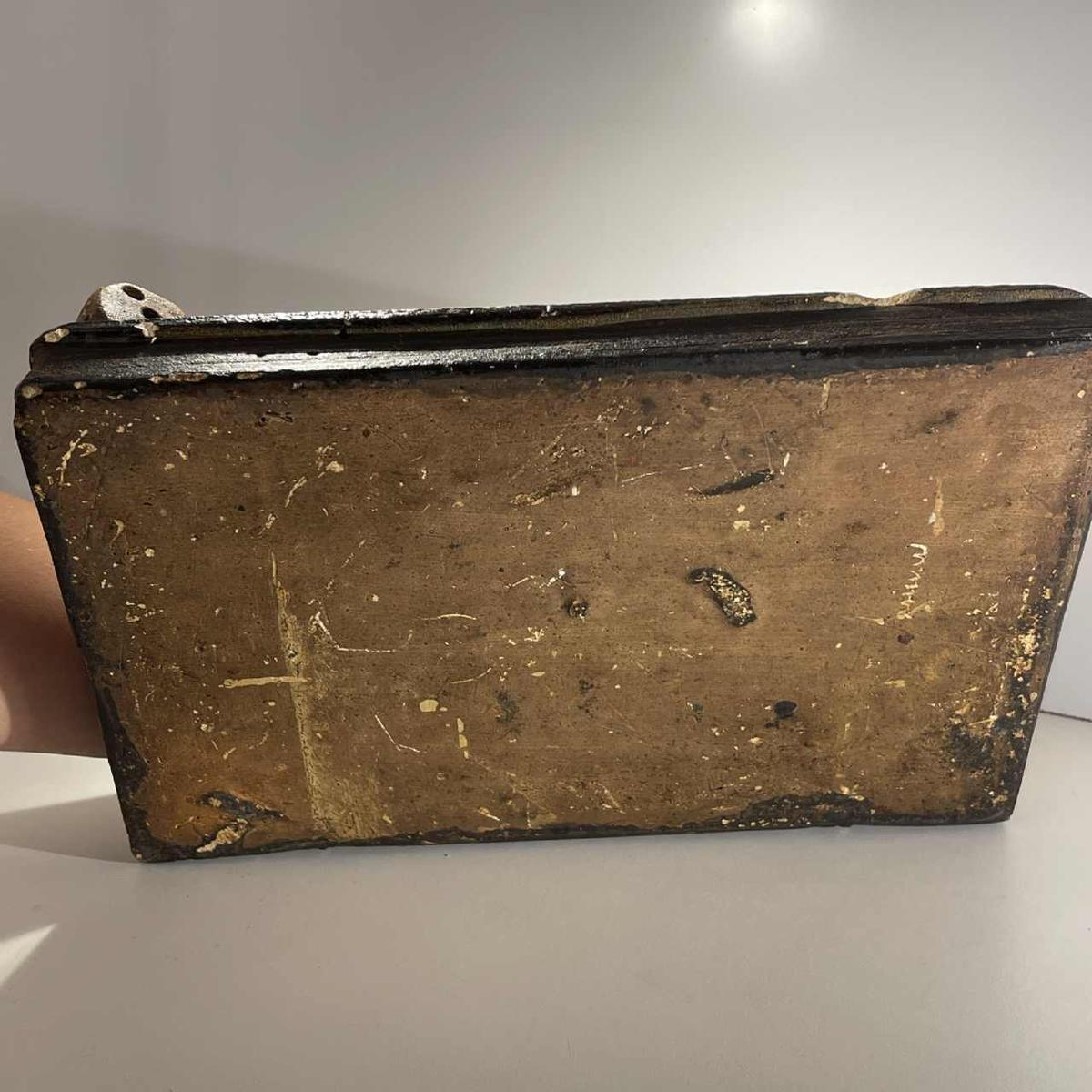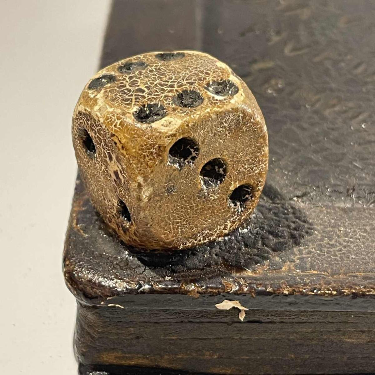 Patinated plaster sculpture depicting a human skull placed on a grimoire, accompanied by a die. On the grimoire is a Latin inscription: “Statutum est hominibus semel mori,” which translates as: “It is established that men must die only once.” The composition thus illustrates the classical memento mori theme, reminding us of the fragility of life and the role of chance in existence.