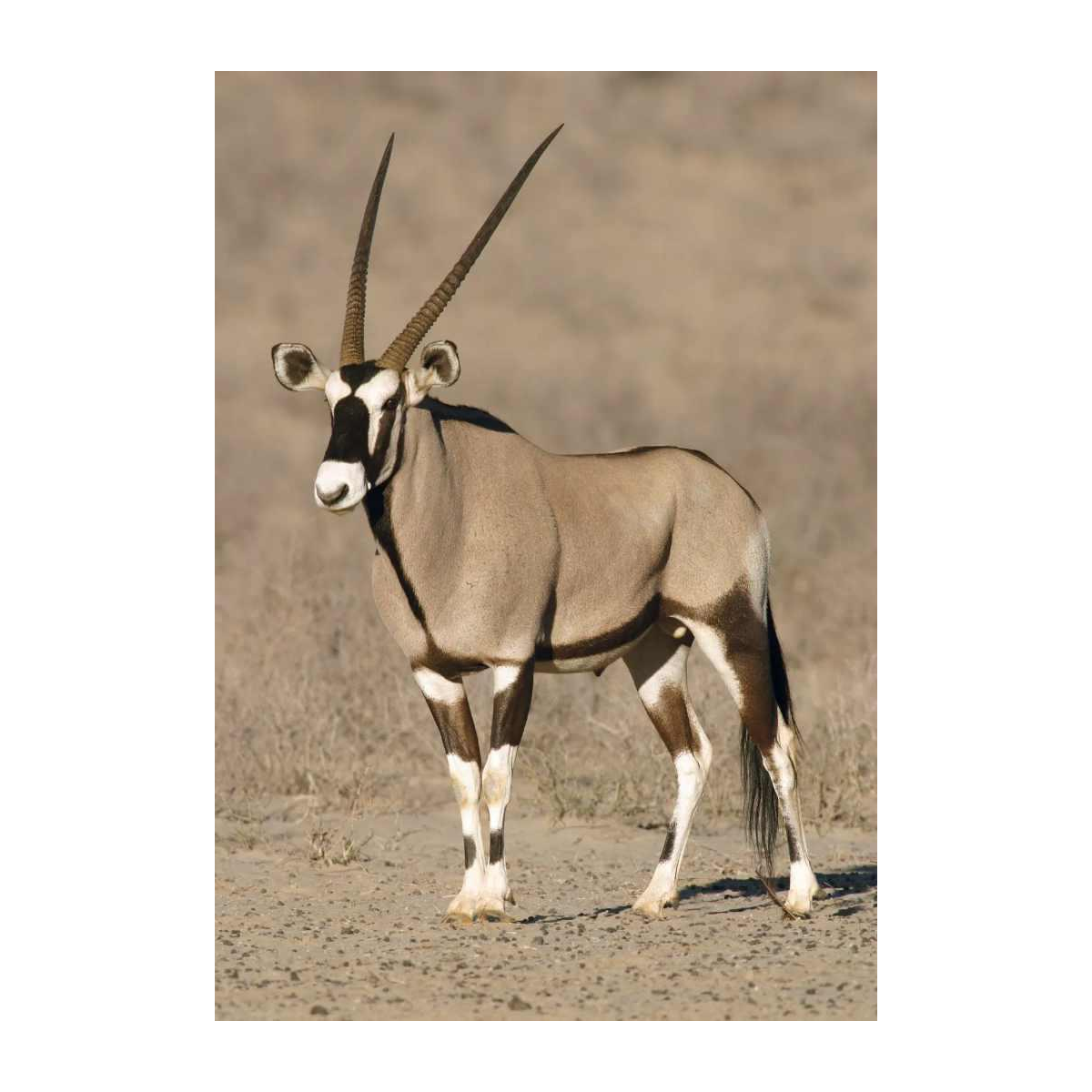 A genus of gazelle or antelope in the Bovidae family that lives in Africa, especially in the savannah, as well as in the Arabian Peninsula, where they had disappeared before being reintroduced. Oryx are typically recognised by their long, thin, straight horns pointing backwards, their relatively short mane, their hump on the shoulder and their large hooves. Their coat is fine, white with black, grey and/or brown markings. Both sexes have horns. They have a height at the withers of 81 to 120 cm and a body mass of 65 to 200 kg. Their horns measure between 38 and 127 cm.