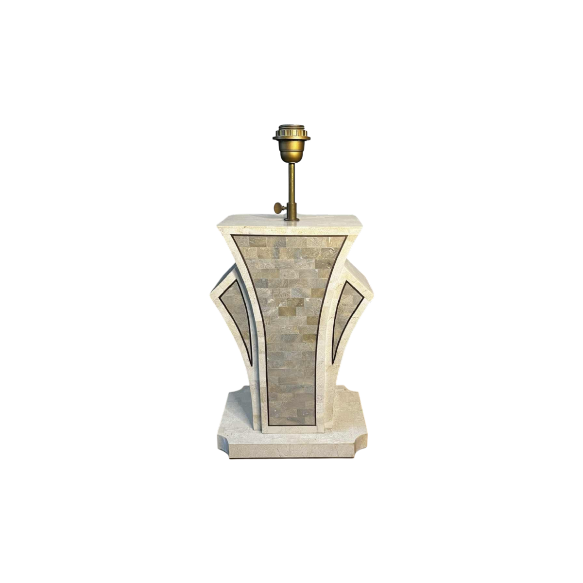 The lamp is made from tessellated stone, a technique in which small pieces of stone are assembled in a mosaic pattern. The brass fillet inlays create graphic contours that accentuate its interesting, geometric and flared design. This lamp is in the Hollywood Rengency style of the 1970s, reminiscent of the ‘Gatsby' style of the Art Deco period of the 1930s.