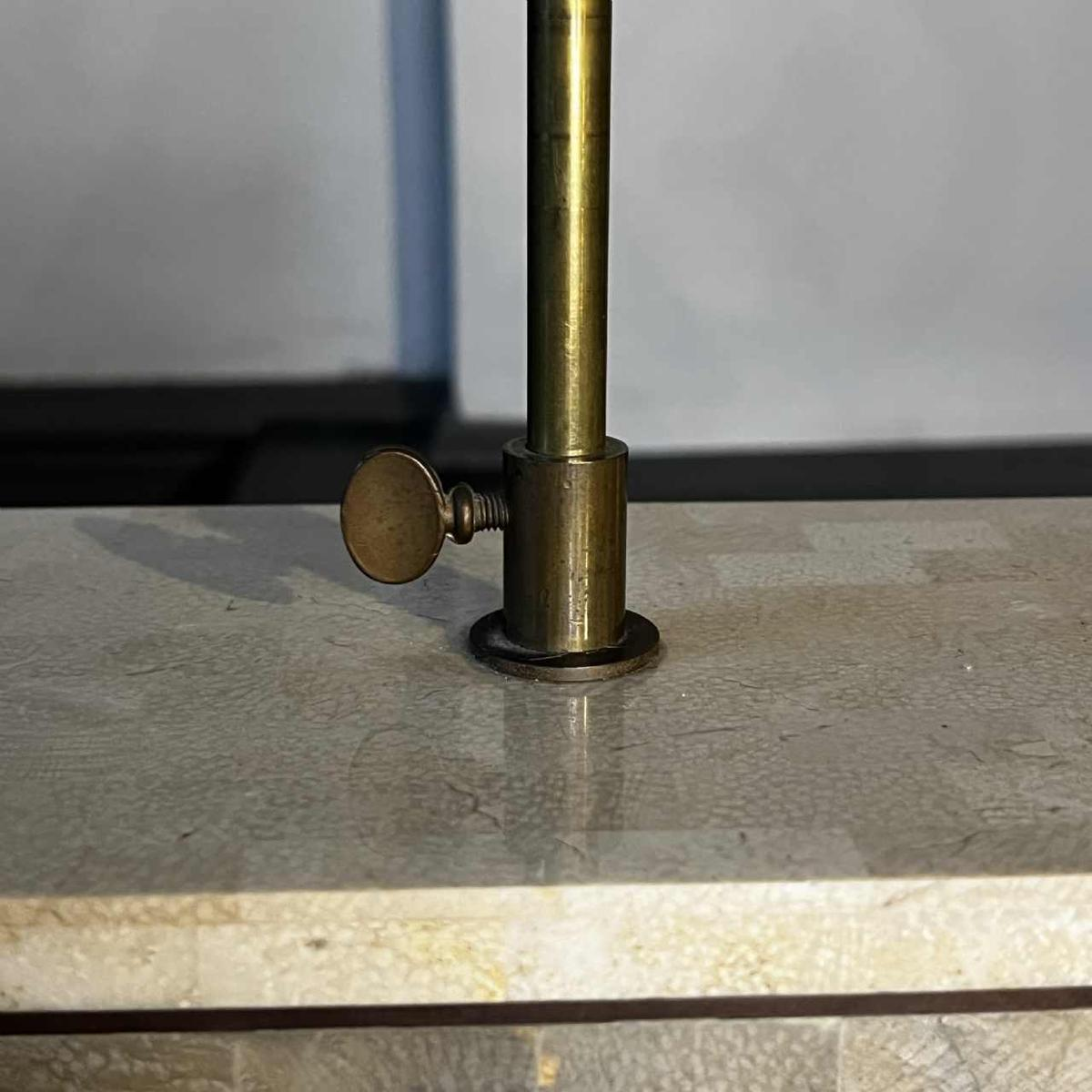 Table lamp in stone inlay (travertine) and brass fillet inlay, designed by Mailtand Smith in the USA in the 1970s.