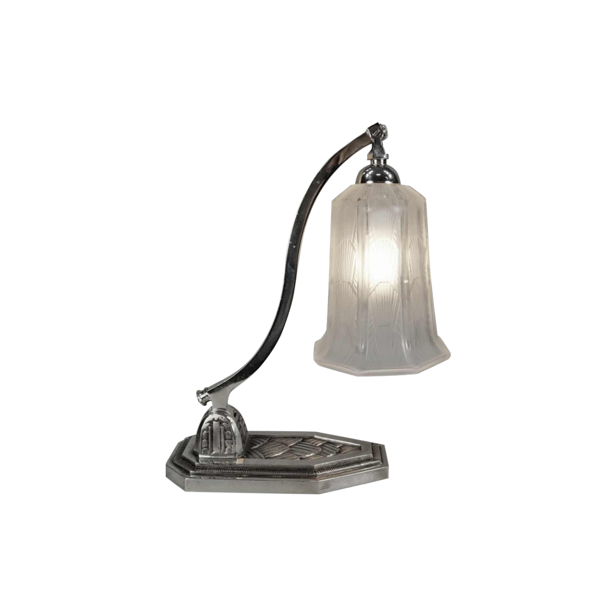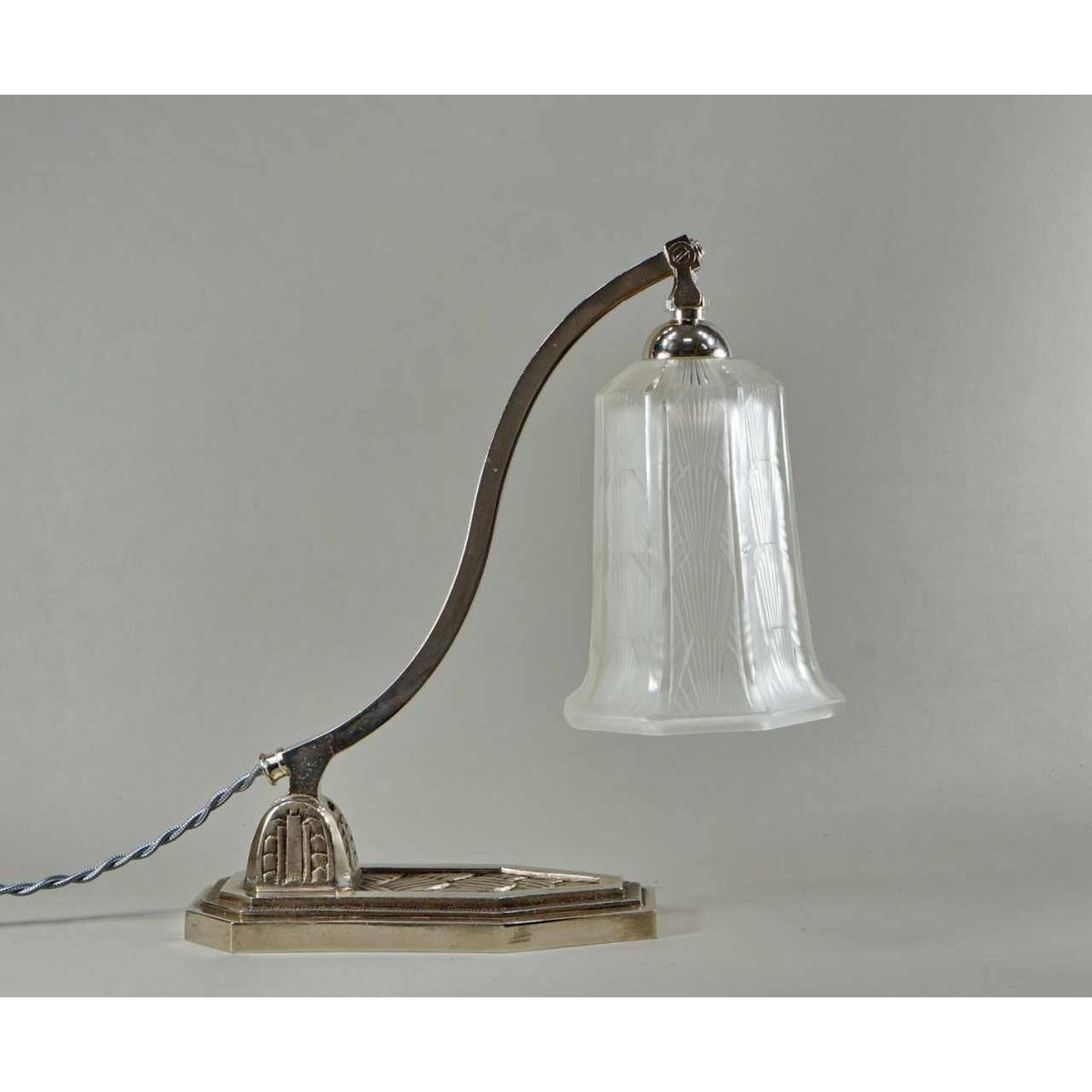 A top quality French art deco lamp in nickel plated bronze. Holding a stunning shade in moulded-pressed glass produced for H&V by Verreries des Hanots. Like Verlys one of the brands of the large Holophane glass company. It is signed Hettier Vincent France. The excellent base is designed in such way that this lamp can be used both as desk lamp and as piano lamp. The lamp is about 29 cm high (11-7/16), And the footplate is 18x8,7 cm. It's in very good condition. The base is replated and patinated. It is rewired with cloth covered twisted cord and a european E14 socket. For the US or Japan I will wire the lamp with an American candelabra base socket and 2-prong plug.