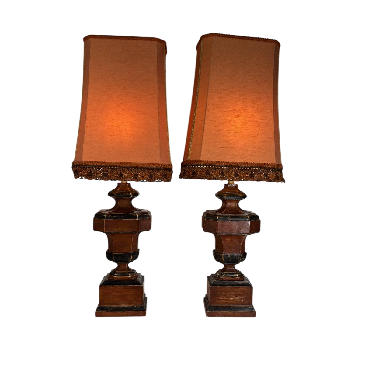 Important pair of Italian-made table lamps, produced around the mid-20th century, in carved and patinated wood. The stems are each made from a single piece of wood, turned and profiled according to a baluster-like design, evoking classical architecture reinterpreted in the Italian aesthetic of the 1950s and 1960s.