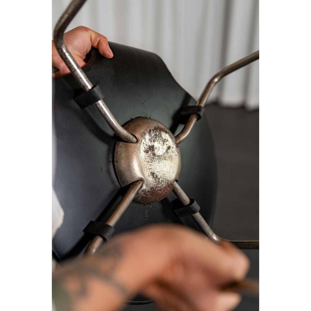 This chair is in good vintage condition but shows signs of wear and patina due to age and use, such as dents and scratches on the wood and significant pitting on the metal structure.