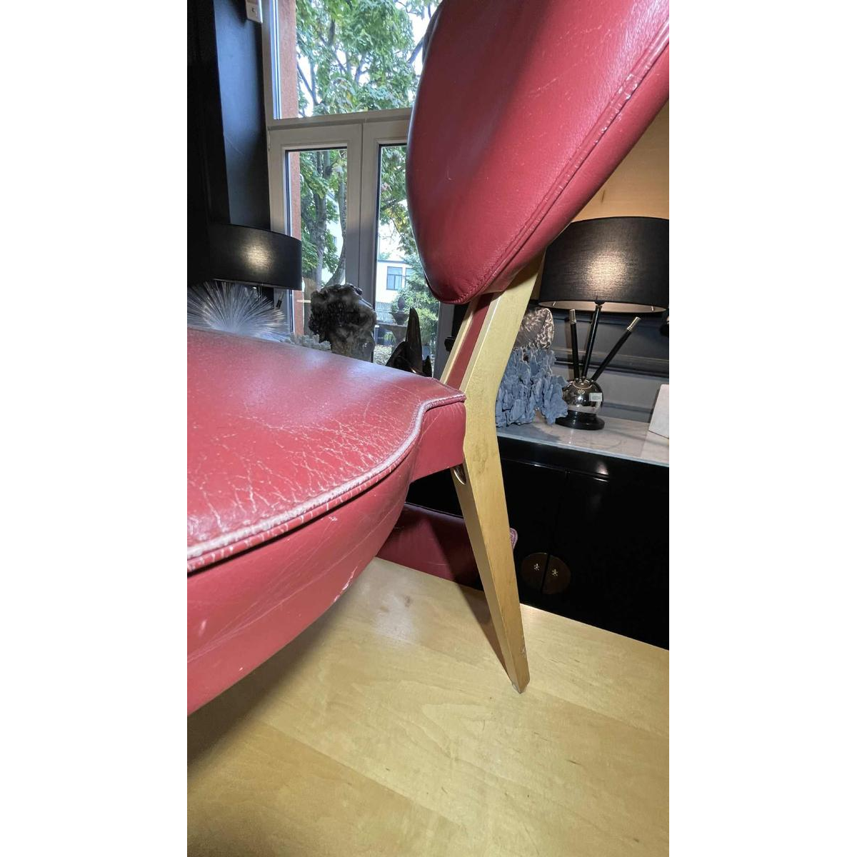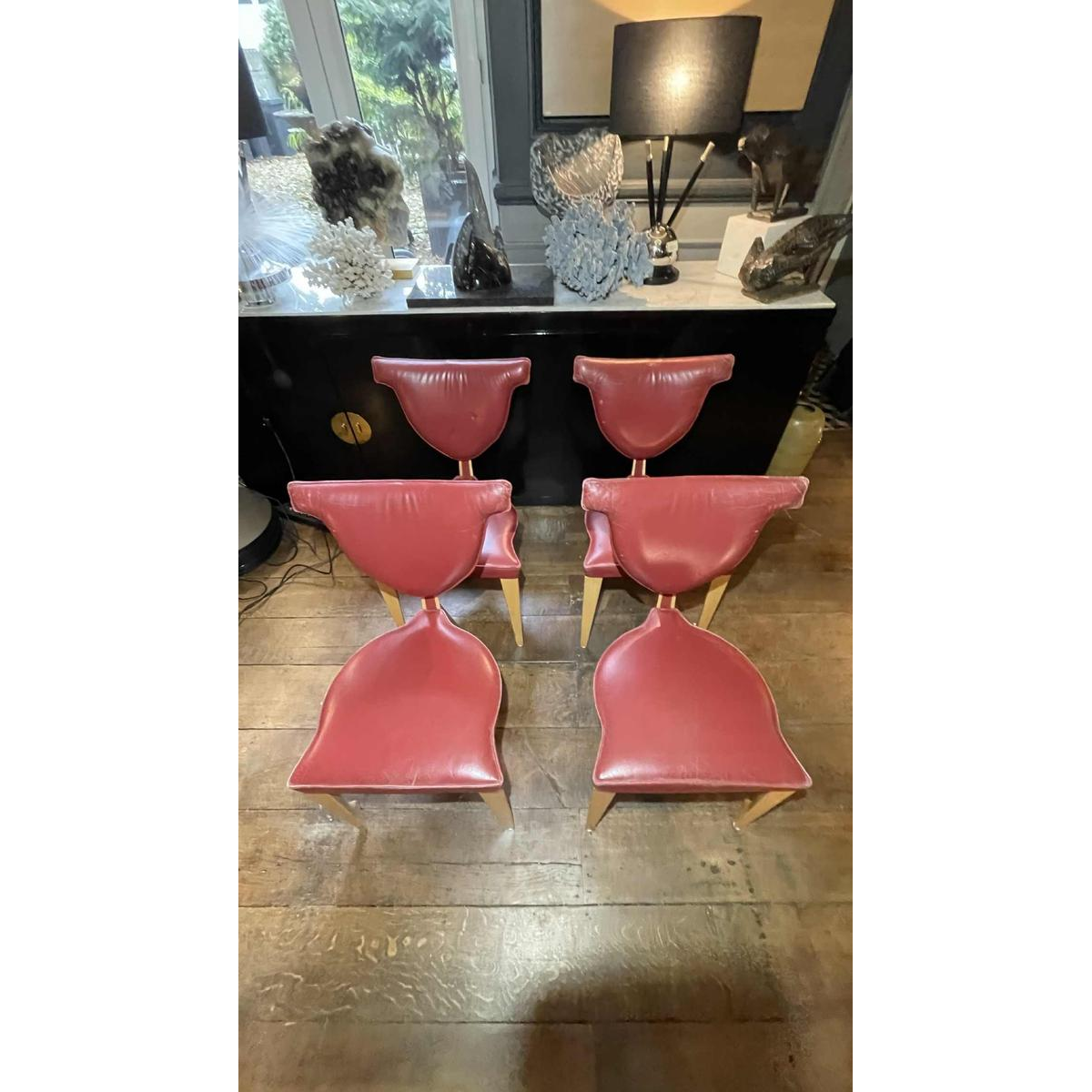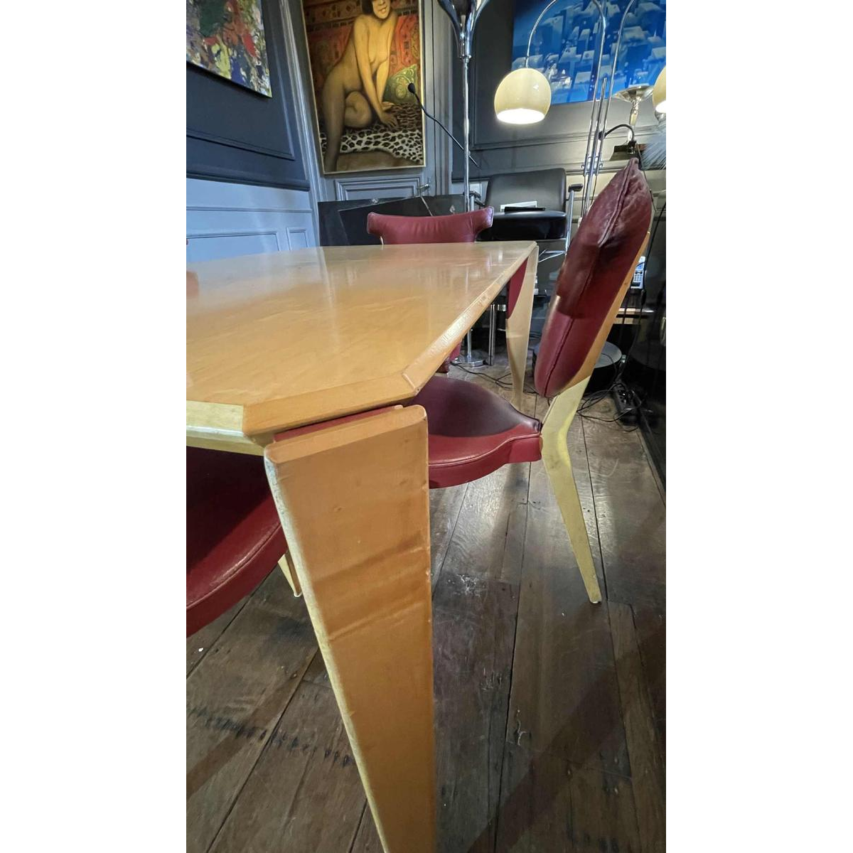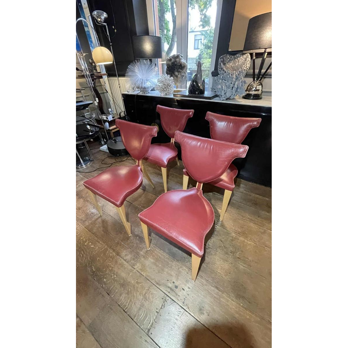 Made of maple wood, cast iron painted burgundy and burgundy leather, this dining set is qualitative.