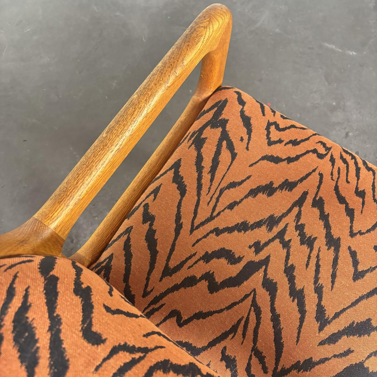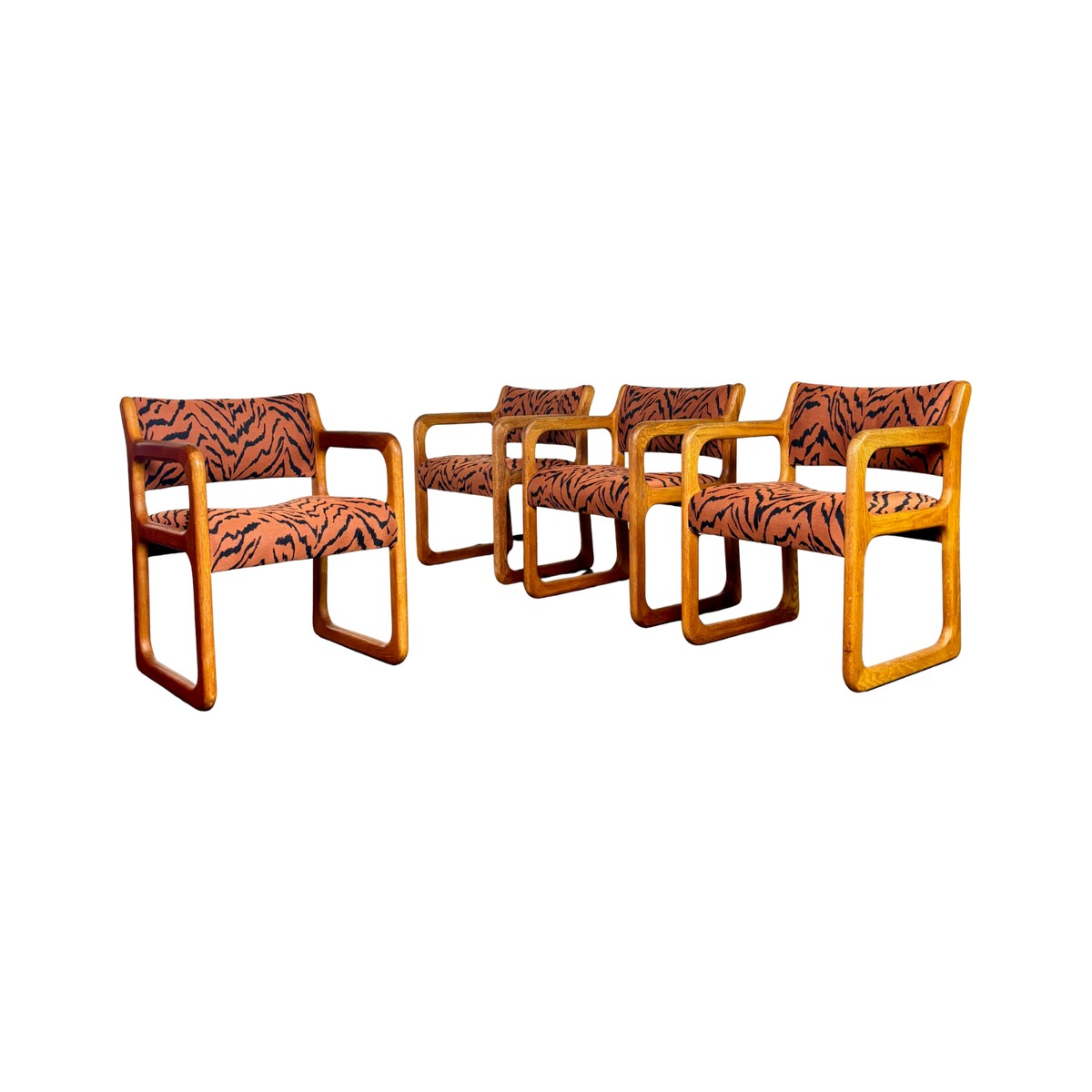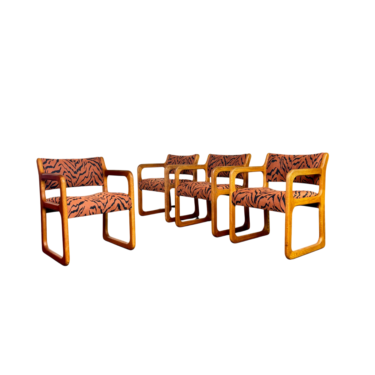 Set of 4 Scandinavian teak sleigh chairs, fully reupholstered and covered in tiger jacquard fabric.