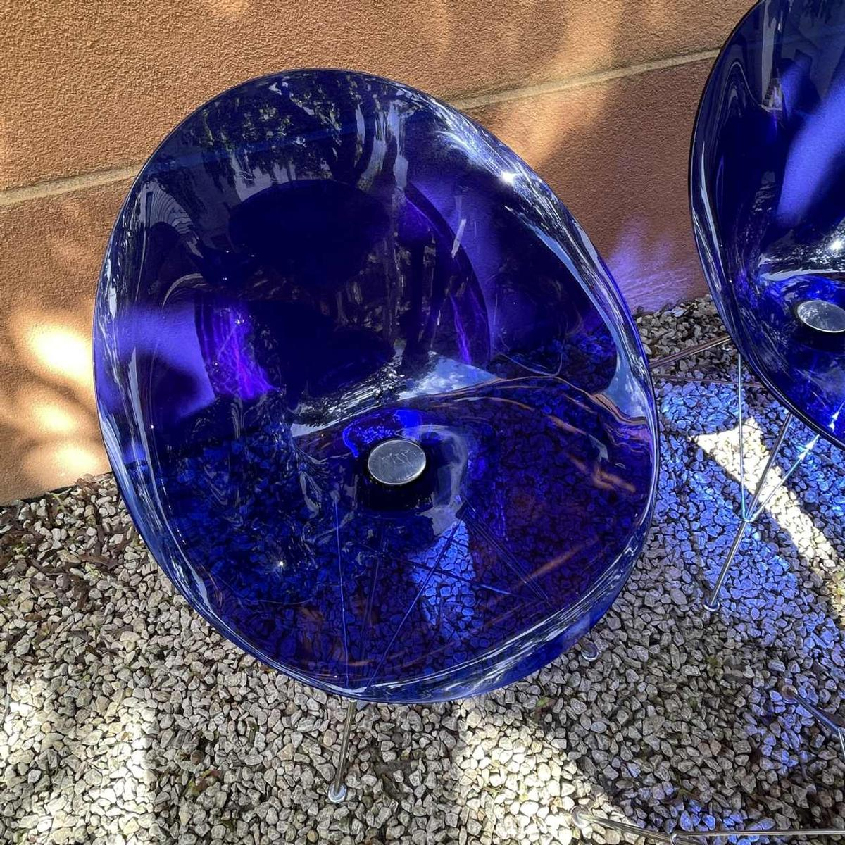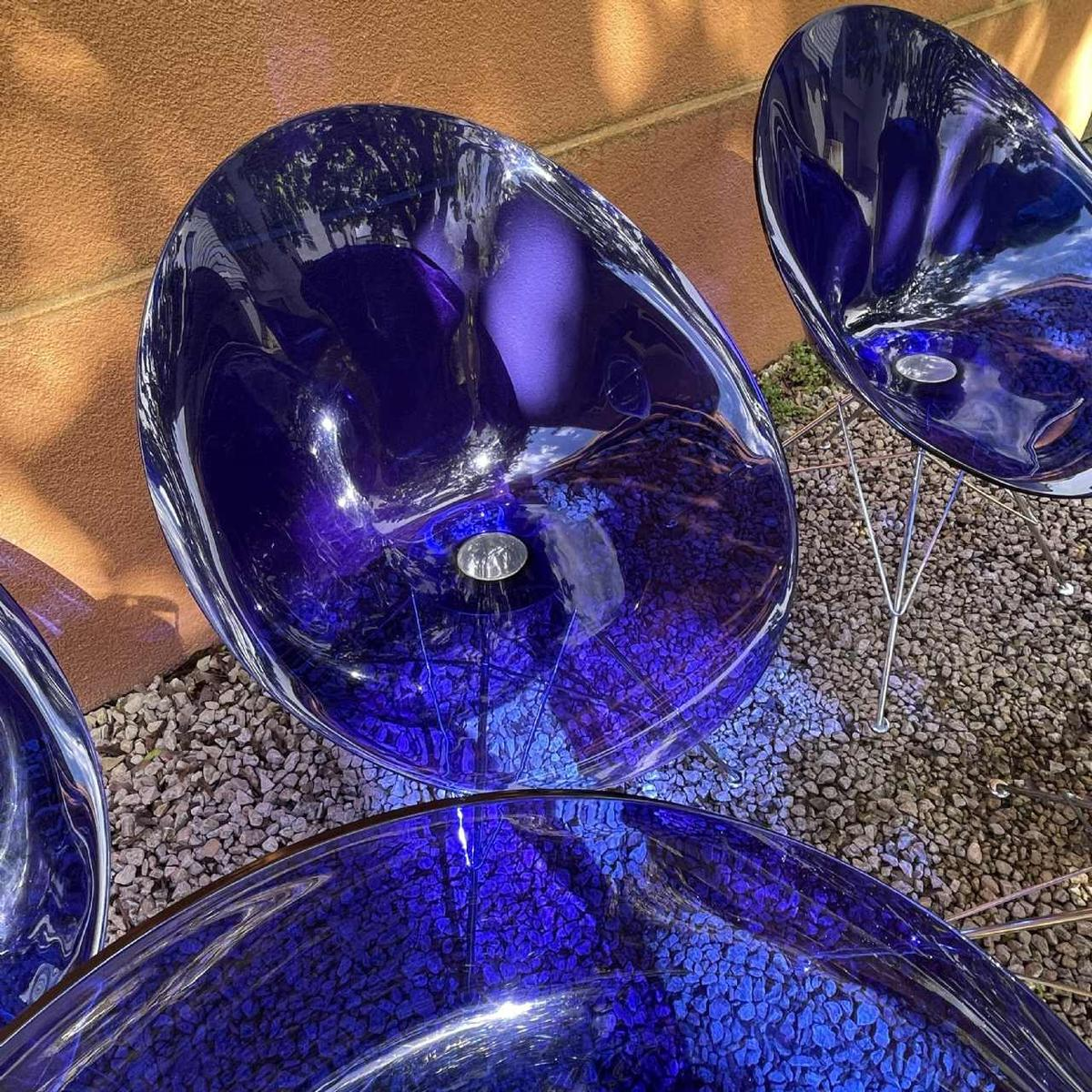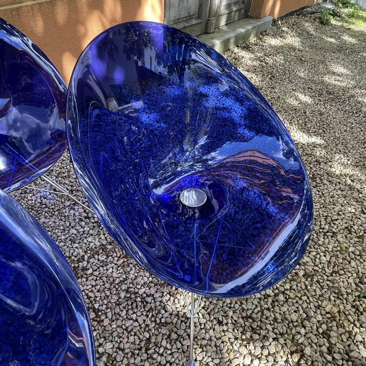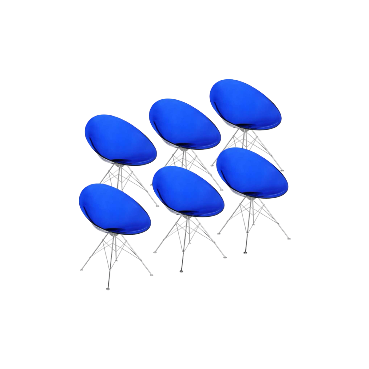 Series of 6 "ERO S" chairs with cathedral base in chromed steel and ovoid seat in blue polycarbonate designed by Philippe Starck, published by Kartell Italy in 1999.