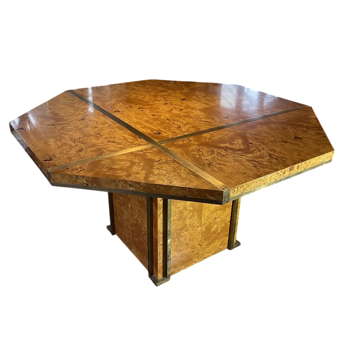 Dining table for up to 12 people , in burr/walnut burl with gilt brass details, equipped with two extensions integrated into the central leg.