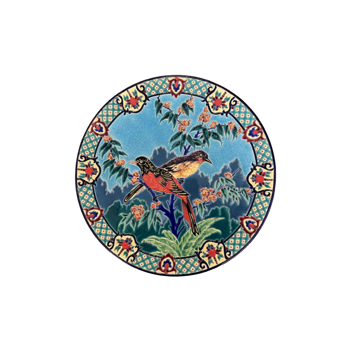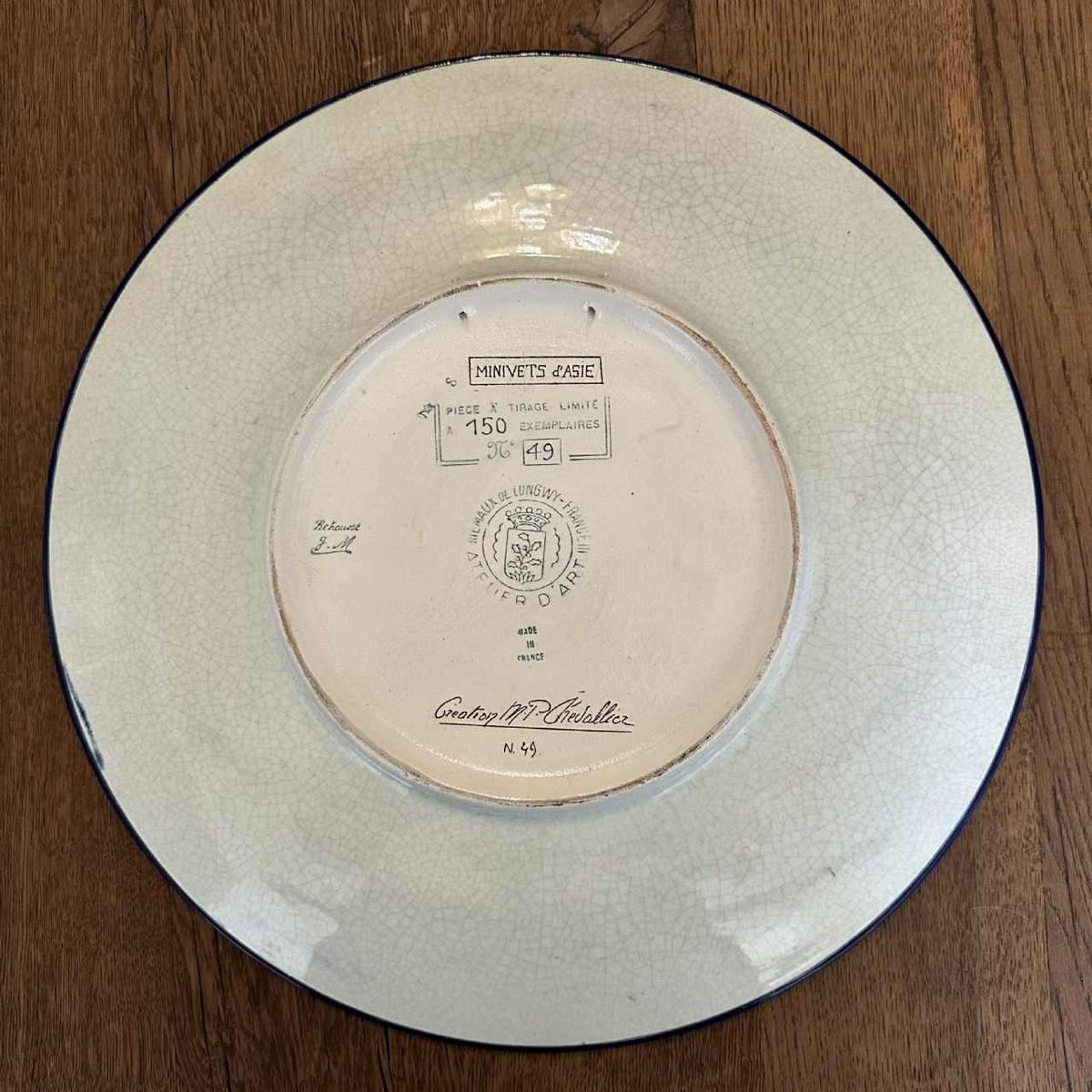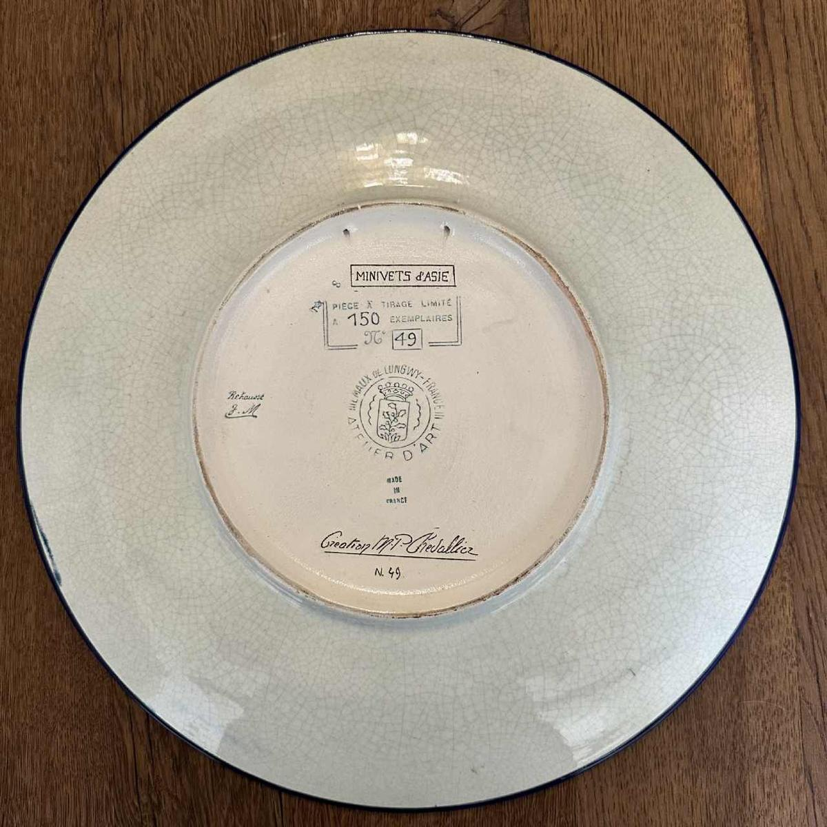 37 cm dish entitled “Minivets d'Asie” depicting 2 birds on a foliage background.