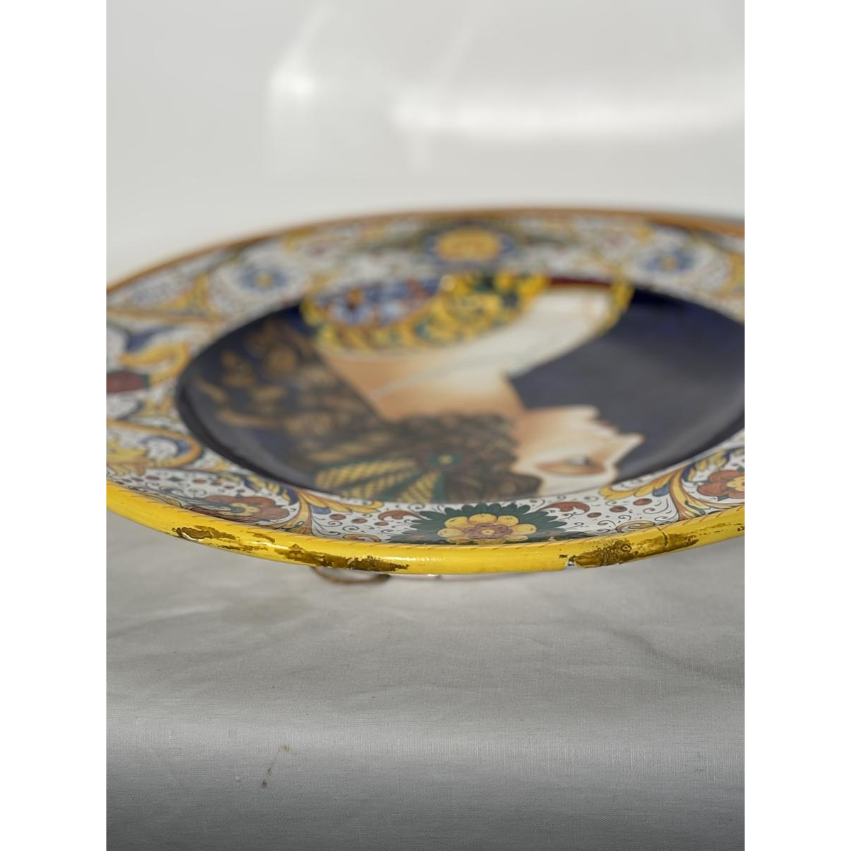 The dish depicts a female profile in the style of the "Bella Donna" of the Italian Renaissance. The portrait, rendered with exquisitely delicate features, stands out against a deep blue background.