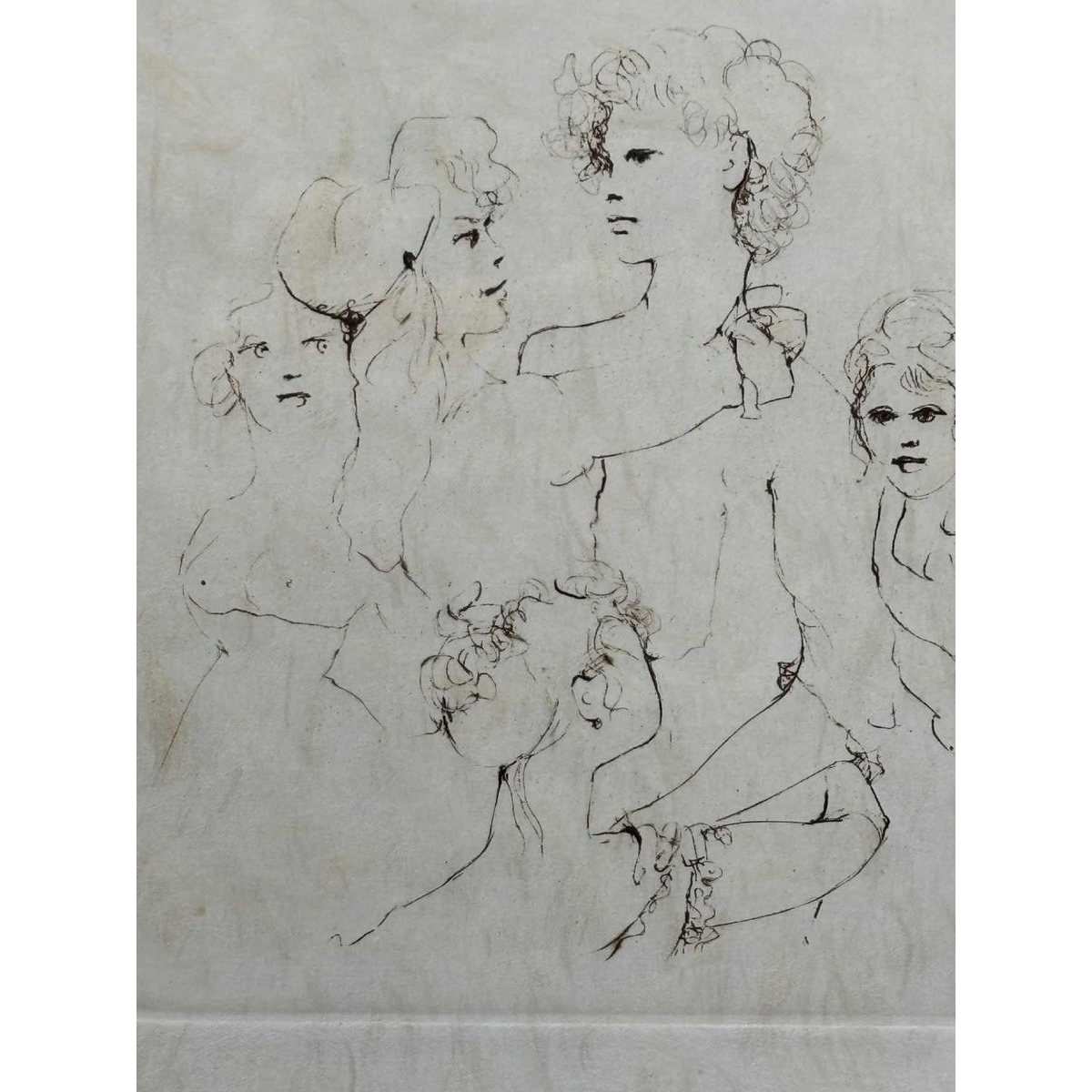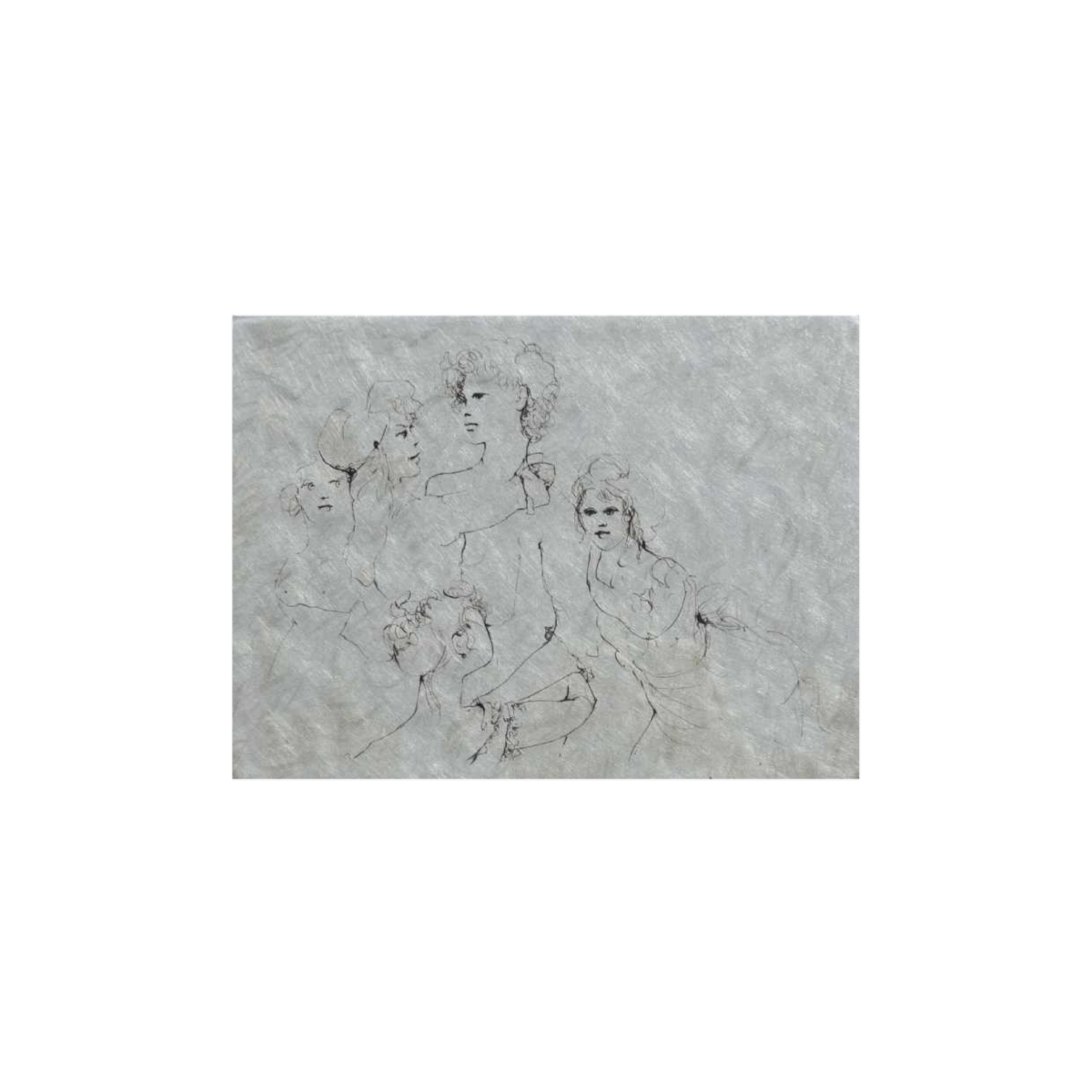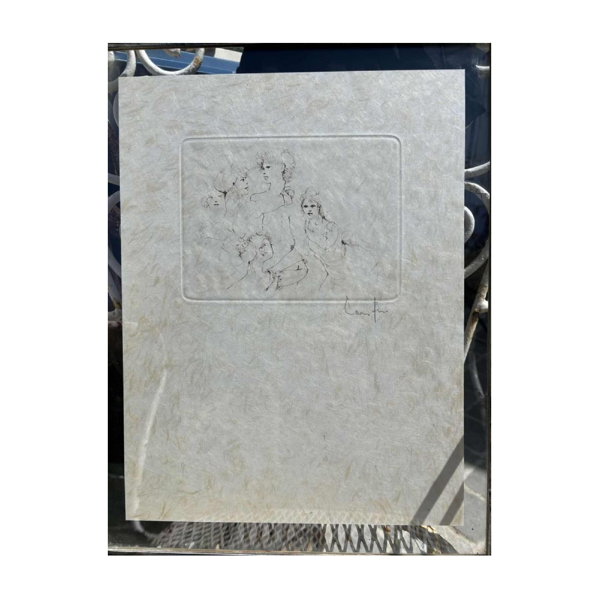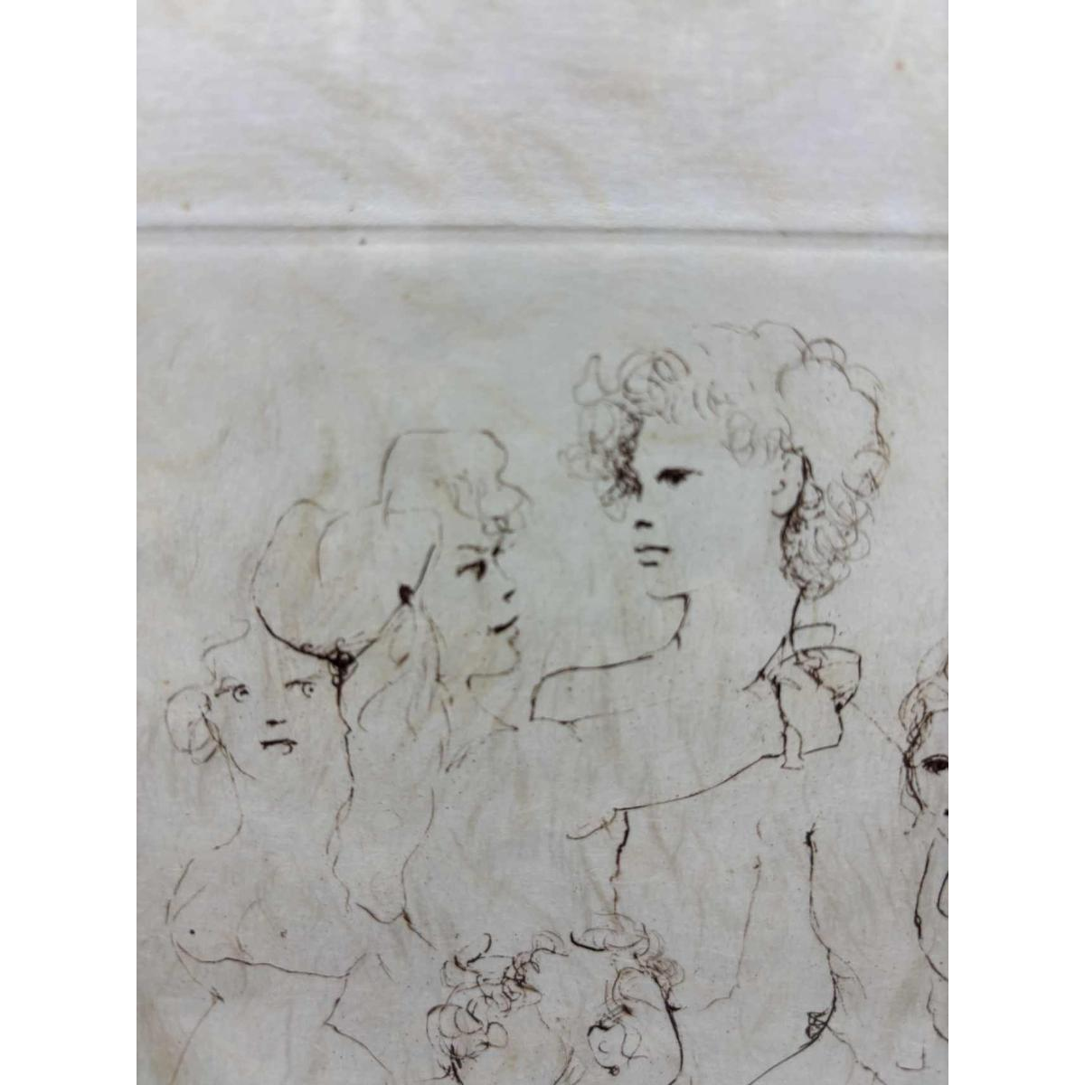 Original intaglio print by Leonor Fini, hand-signed in pencil by the artist, lower right. This composition features a group of young people. Printed on fine quality Japon paper, with a delicate moiré aspect. Well-marked tray, clear impression, revealing a meticulous print. Presented in a blackened and silvered wooden frame, between two glasses. Very fine condition. Dimensions: Frame: 48 x 38 cm Leaf: 41 x 31 cm Print: 28 x 20 cm