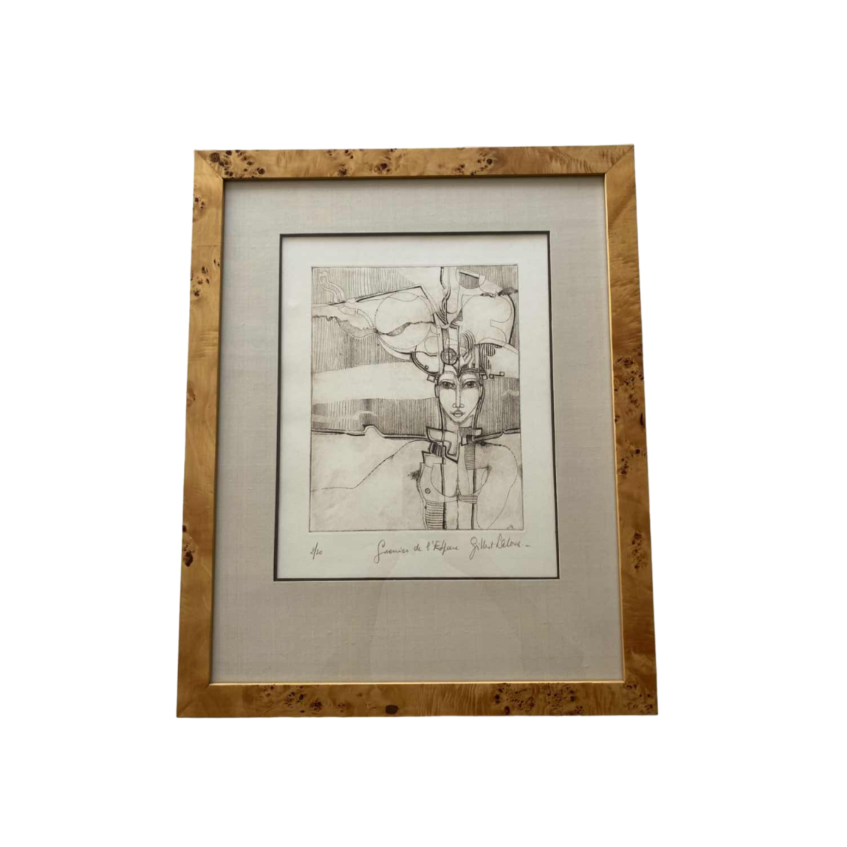 Drawing of an enigmatic character. Signed Gilbert Laloux and numbered 2/20. Etching framed under glass with cloth passe partout and wooden frame. Size: 62 x 50 cm