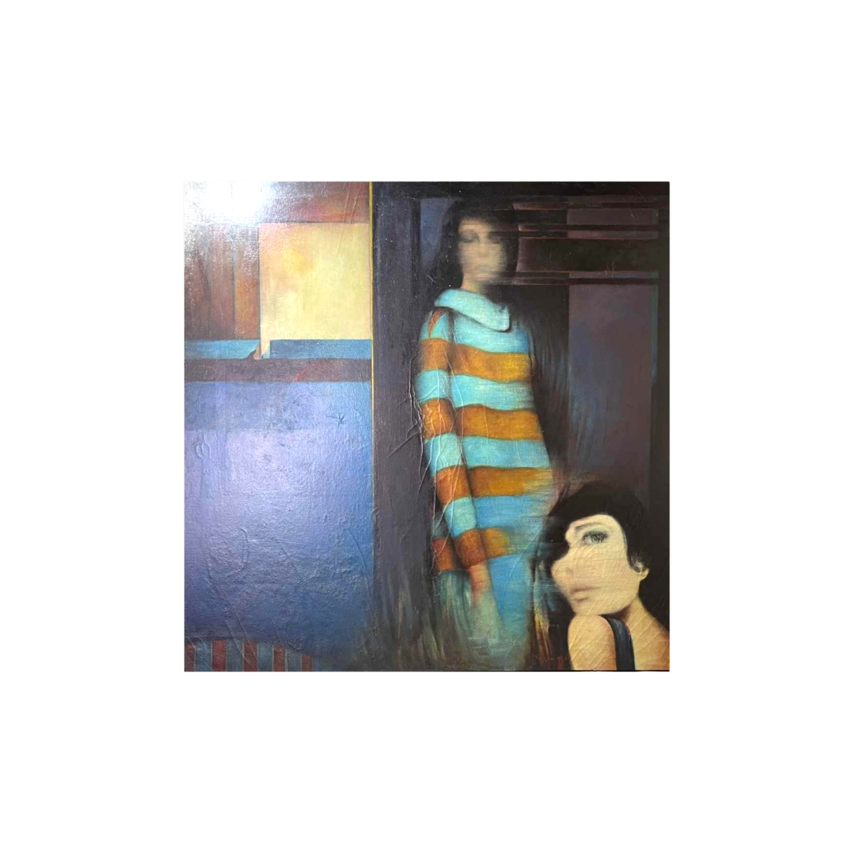 The artist illustrates an intimate scene in which two women, caught in the midst of an exchange, seem to be caught in the middle of a discussion.