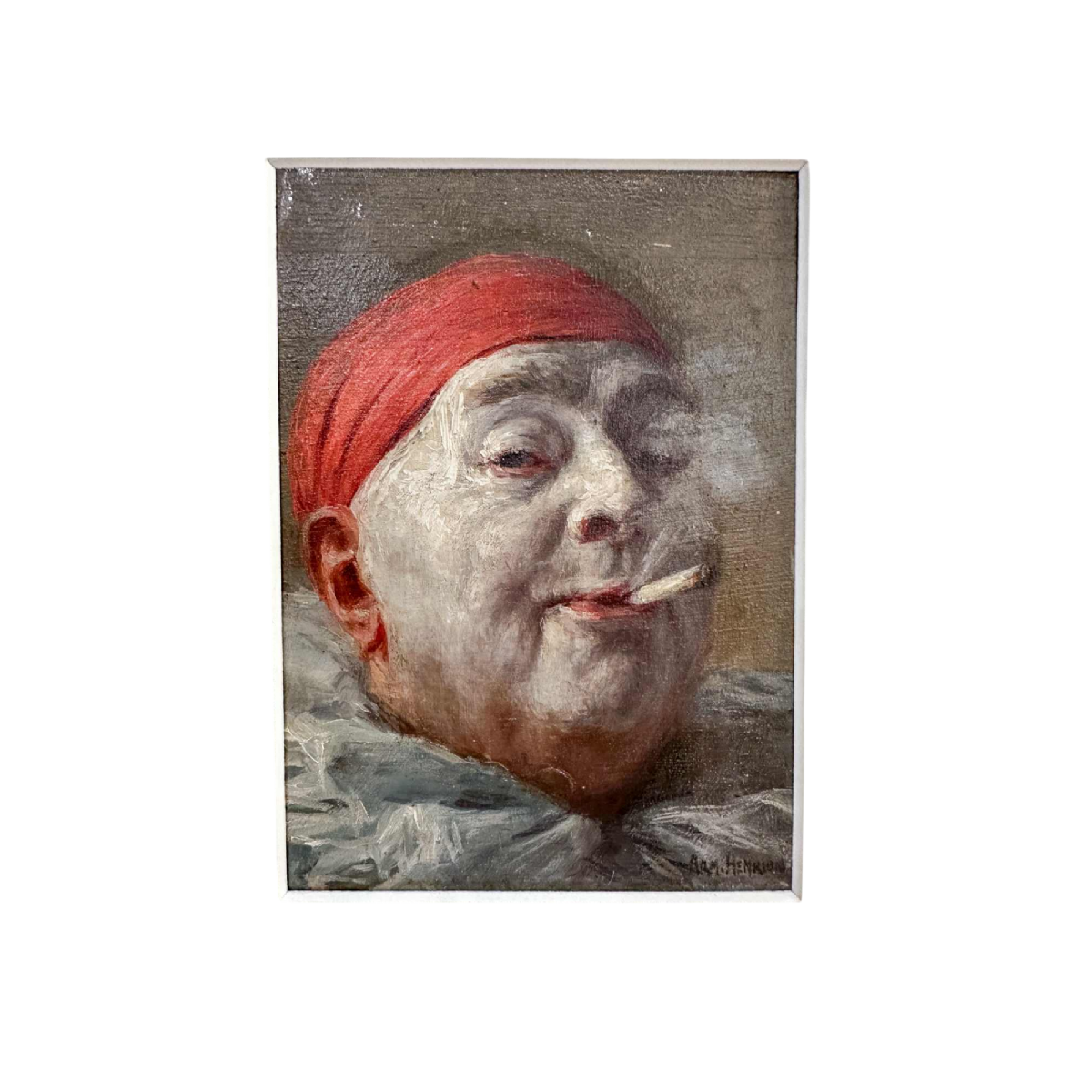 Painting by Armand Henrion, self-portrait as Pierrot, in his emblematic style; oil on canvas, framed with passe-partout