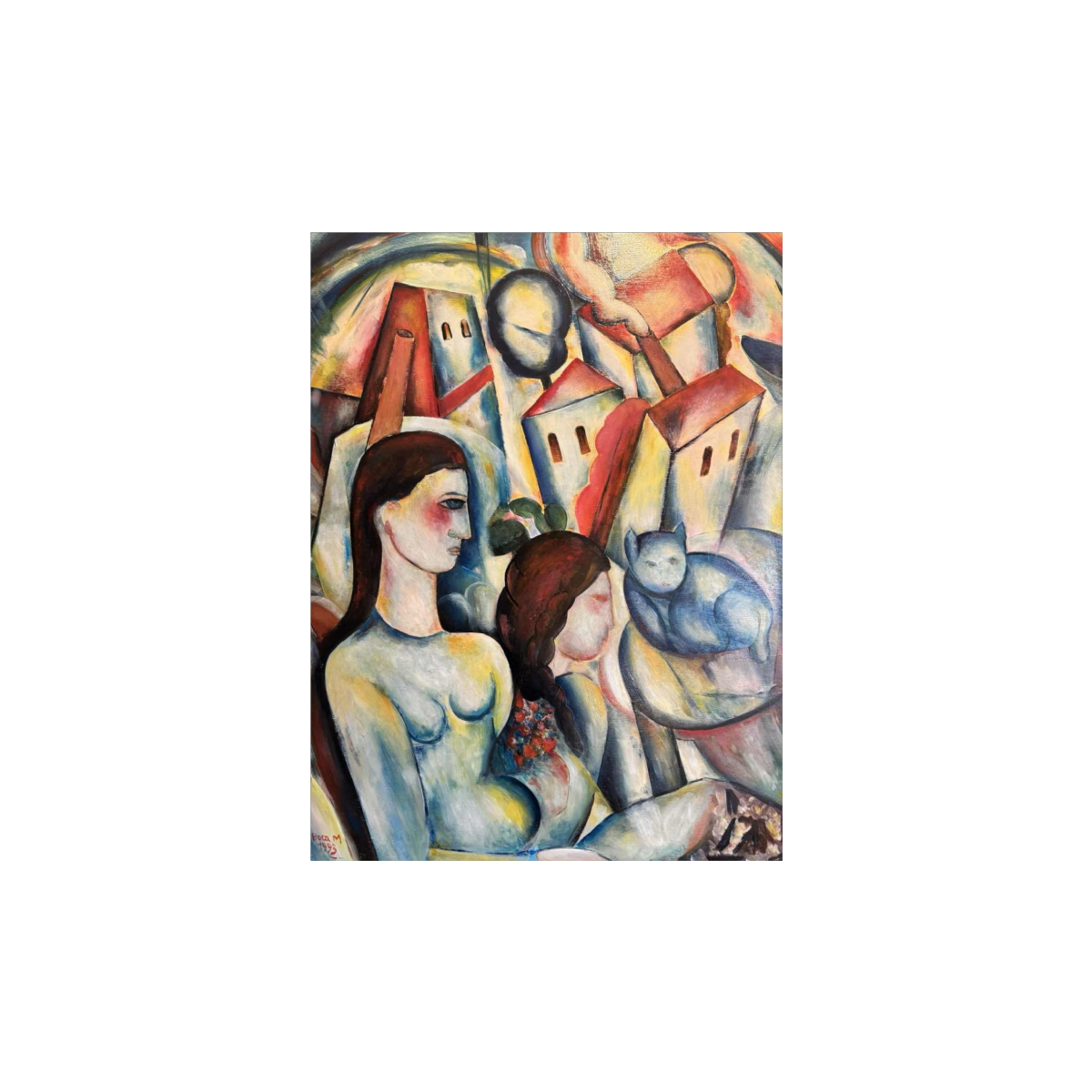 Beautiful work by the artist who died 4 years ago from an important art collection in the Namur region. Possibility to buy the work without the frame. Marcel Hocq is a self-taught Belgian painter, sculptor and expressionist ceramist, born in 1933. After gradually freeing himself from various artistic currents, his work ends up translating all the strength of a renewed expressionism through solidly framed paintings whose "sobriety of the means accentuates the poetic climate". If he is inspired by childhood memories with nostalgia (fairgrounds, rides, circuses, engagement and weddings), if he likes animals (cats, goats and horses), the woman remains, nevertheless, the centre of her concerns; he represents her with an impassive and serene face, only illuminated by large vague eyes that stare at the distance. His paintings exhibited both in Belgium and abroad are found in the private (Belgium, France, Canada, Netherlands, Germany, Spain) and public collections (collections of the Belgian State, the Walloon Region, the Province of Namur, the cities of Kaprijke, Sambreville).