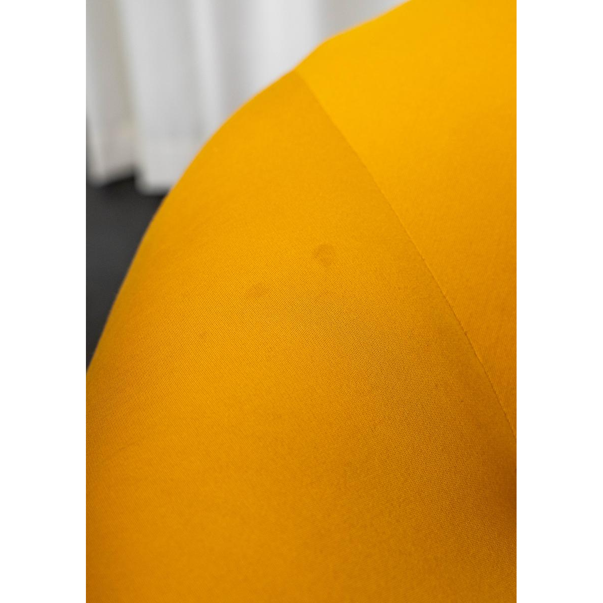 These armchairs are in good vintage condition but they have some defects, notably on the red armchair where there are small stitching repairs and a lighter stain on one side, and a few small stains on one of the yellow armchairs.
