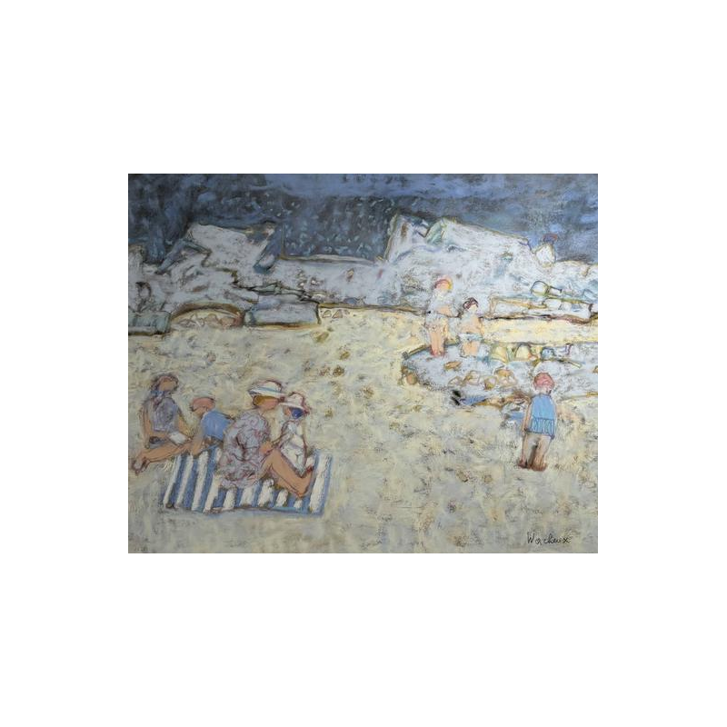 A beautiful beach scene by Yves Wacheux (1933-2023), a 20th-century painter, depicting a group of figures on the sand facing the sea, in a soft, slightly hazy atmosphere. The artist captures a simple, quiet moment of life, where adults and children share the space between the sea and the dunes.