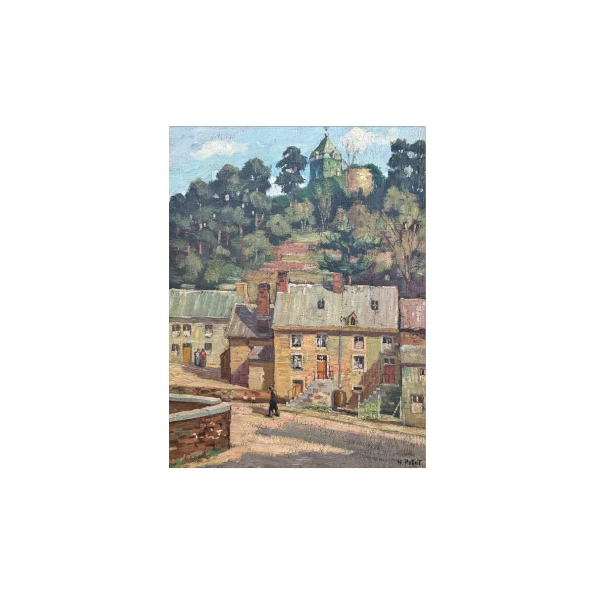 Nicolas PITOT ‘Comblain-au-Pont and the Saint Martin tower’ painting oil on panel, ca 1950