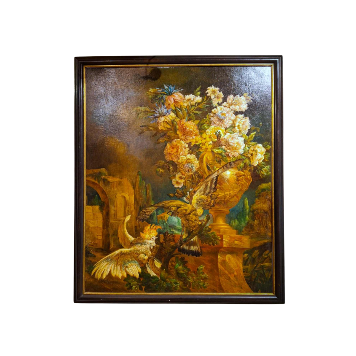 Large decorative painting oil on canvas from the 19th century, depicting a cockatoo and a falcon attacking each other in front of an ornamental vase filled with flowers in an idyllic landscape.
