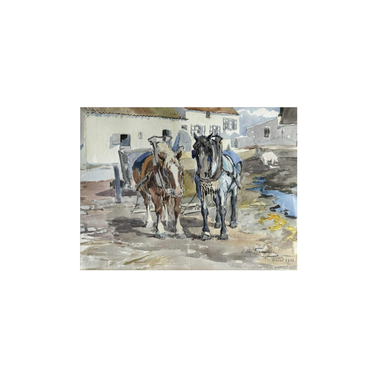 Victor FERMEUSE ‘Draught horses and pig in the yard at Heyst’ watercolour on paper, 1935