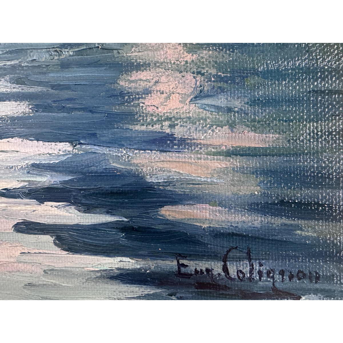Painting signed and dated lower right. Oil on canvas, signed lower left. Eugène Colignon was born on March 23, 1876, in Namur. He studied at the Academy of Fine Arts in Namur, where he was a student of Désiré Merny (1865-1947). He continued his studies at the Brussels Academy under Isidore Verheyden. Eugène Colignon was influenced by the Tervuren School, by T. Baron, and by Neo-Impressionism. He excelled in depicting snowy landscapes. Eugène Colignon died in Beez on January 28, 1961. Source: Wikipedia