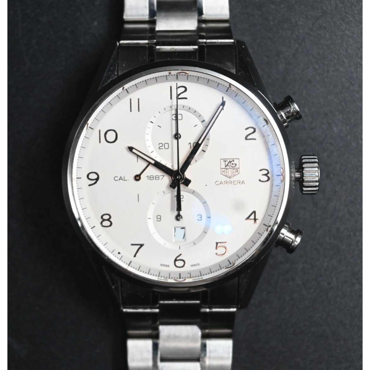 The TAG Heuer Carrera 1887 43 features a 43 mm case, housing Calibre 1887, a self-winding movement with column-wheel chronograph first seen in 2009. Ref. CAR2014.BA0799 has a white dial and stainless steel bracelet.