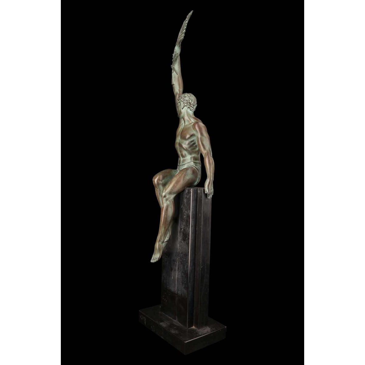 Produced in the first half of the 20th century, this work is fully in line with the Art Deco movement, which valued pure forms, elegance and restrained power. In contrast to abstraction, Art Deco exalted the idealized human figure, often in connection with themes of sport, speed and heroism. The laurel branch, typical of Antiquity, and the athletic style recall the modern Olympic Games and their universal dimension. The classical treatment of the body also evokes Greek sculpture, while adapting to the geometric rigor of Art Deco.