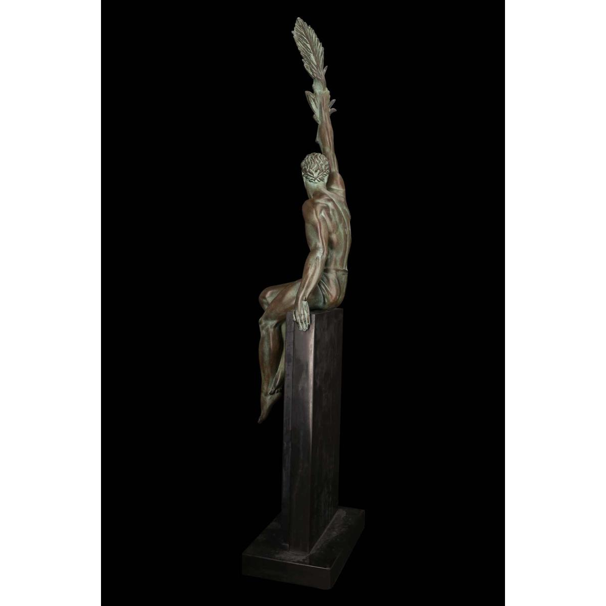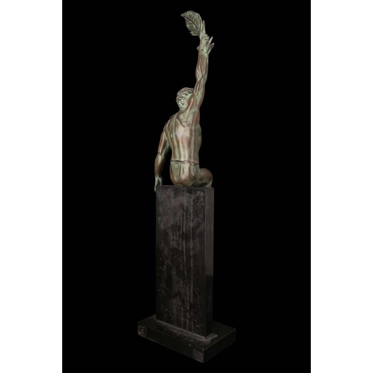 This sculpture in green patinated bronze depicts a male athlete seated on a black marble pedestal, raising high a laurel sprig - a symbol of victory. His muscular body, stretched skyward, expresses his aspiration for excellence. The gaze turned towards his raised hand suggests pride and the quest for glory. The modeling is precise, faithful to the anatomy and imbued with classical idealism. The verdigris patina reinforces the antique effect, while the dynamic pose betrays an Art Deco influence, both stylized and monumental.