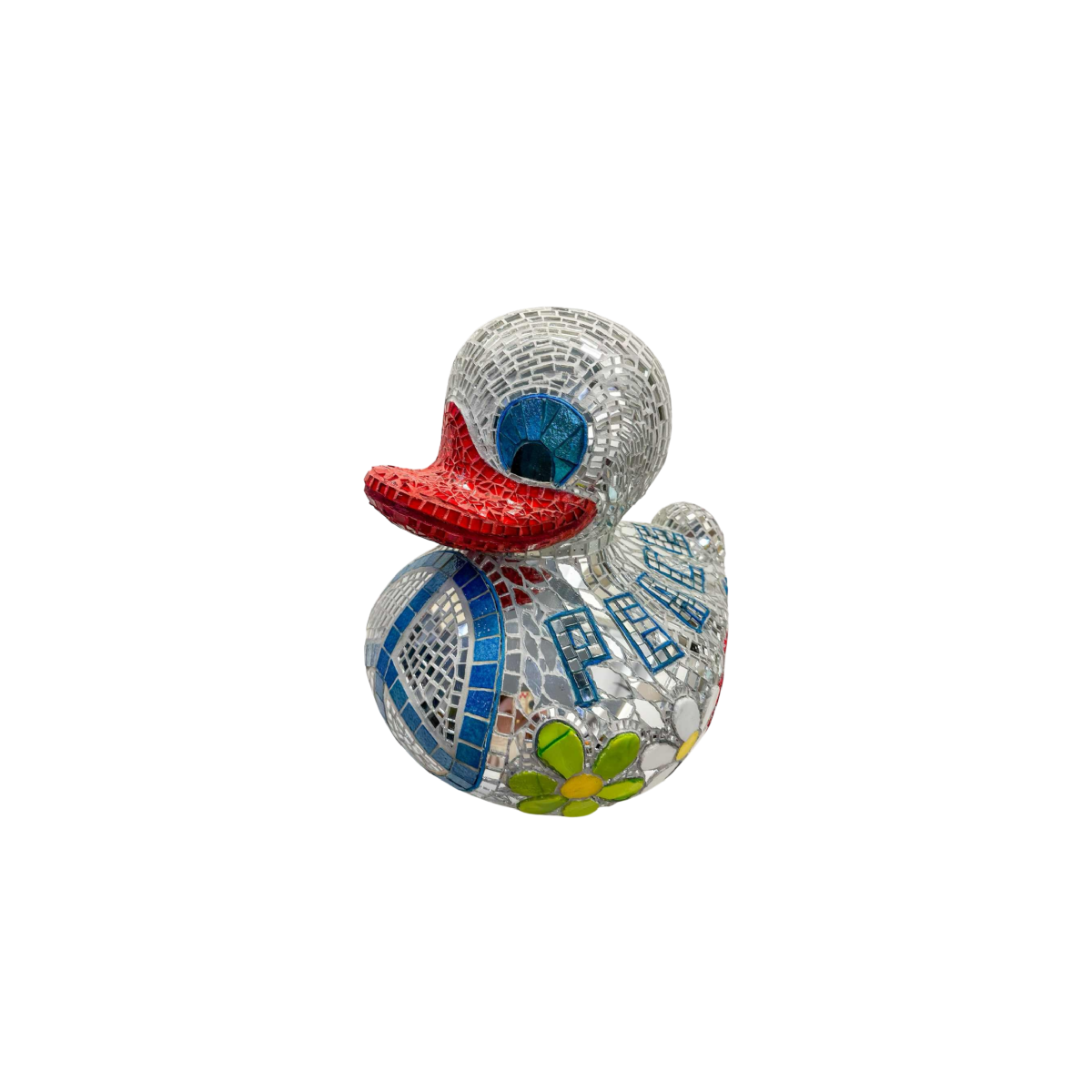 Giant duck in mirrored earthenware with colorful decoration, by Liège mosaic artist Cla Râ Rose; created in 2025.