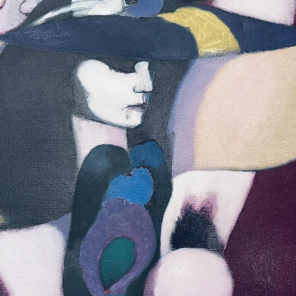 Post-expressionist/Pop Art painting by LUC PEROT, 1978, depicting a nude woman wearing a large hat and a peacock feather scarf. An intimate and peaceful atmosphere, intensified by the unique choice of colour combinations: mauve, turquoise blue, pink, yellow...