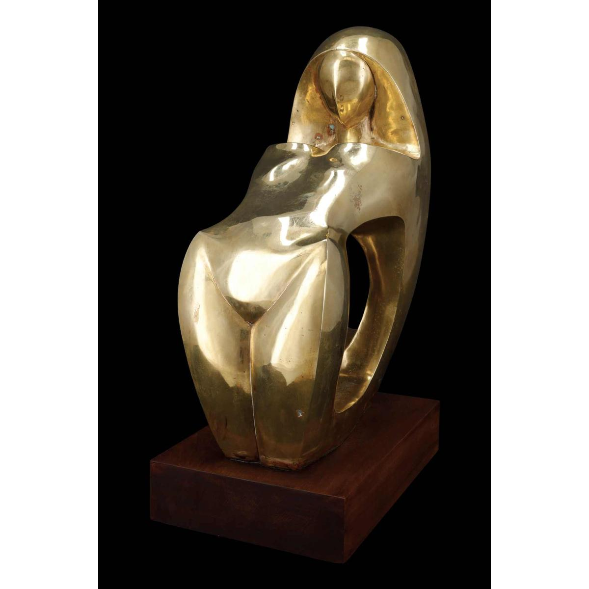 This copper sculpture depicts a stylised, almost abstract female figure in a meditative or maternal posture. The full, sensual forms evoke fertility and inner strength, while the smooth, curved surfaces catch the light, giving the work an almost sacred presence.