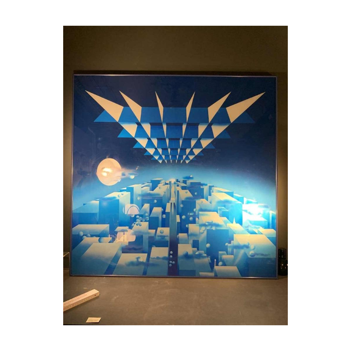 Remarkable and avant-garde technique of realization with the airbrush, painted on the back of the plexiglass but also some clouds and spheres applied to the front on the surface (see photos) giving an effect of shadows and 3D relief.