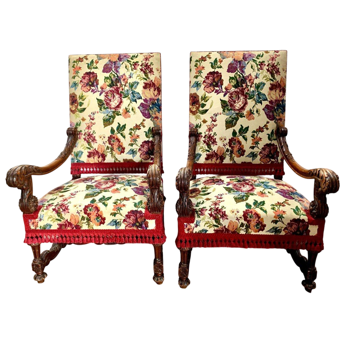 Beautiful pair of Renaissance-style armchairs in solid walnut.