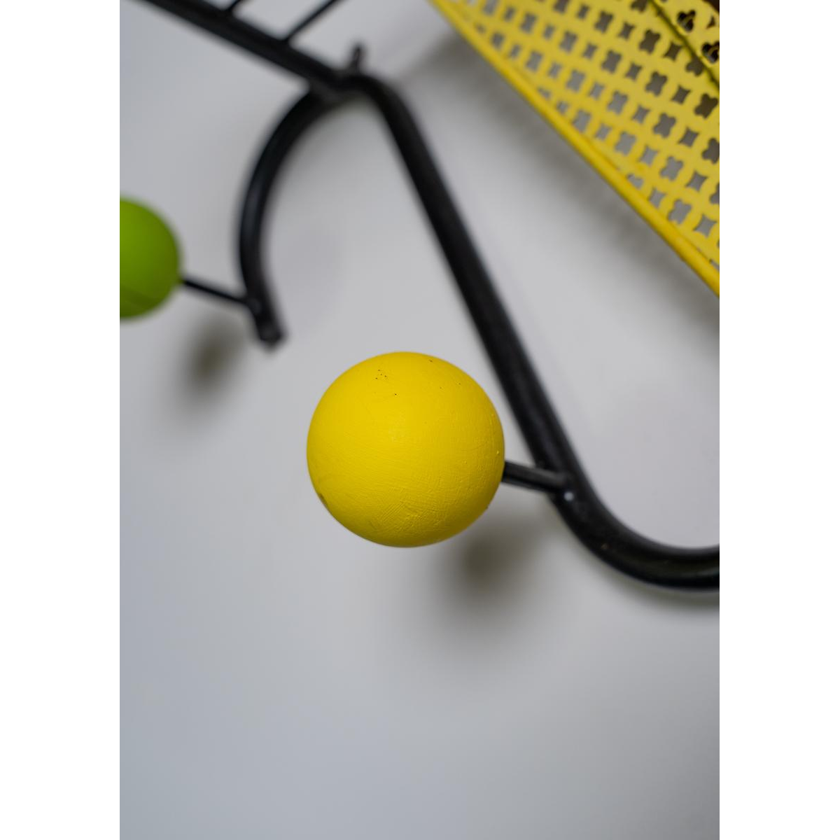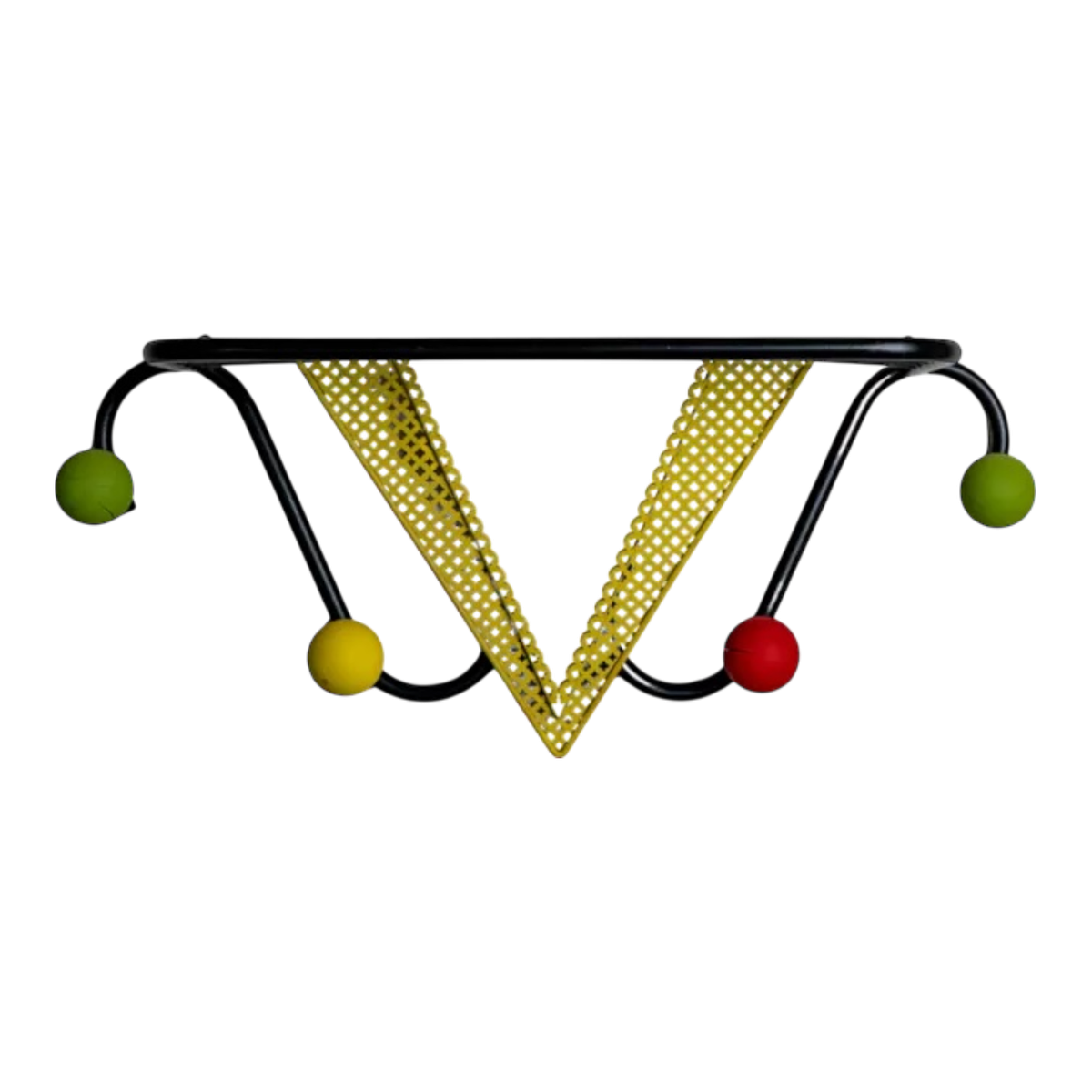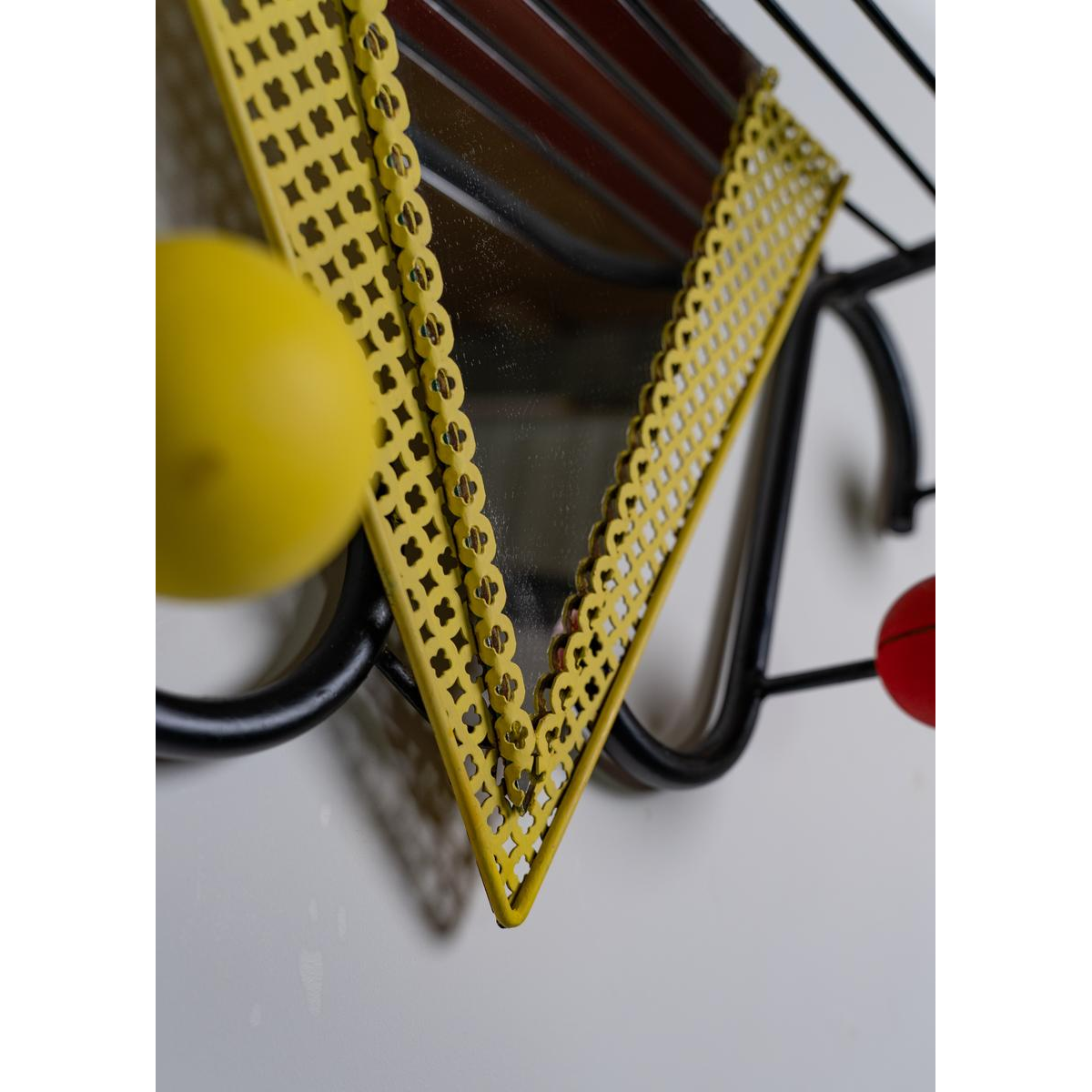Attractive wall-mounted coat rack by Mathieu Matégot from the 1950s/1960s. It features a black tubular metal frame with a yellow, perforated metal triangle in a cloverleaf pattern, known as "rigitulle," which holds a triangular mirror. It also includes a shelf/hat rack and four ball-shaped hooks in red, green, and yellow.