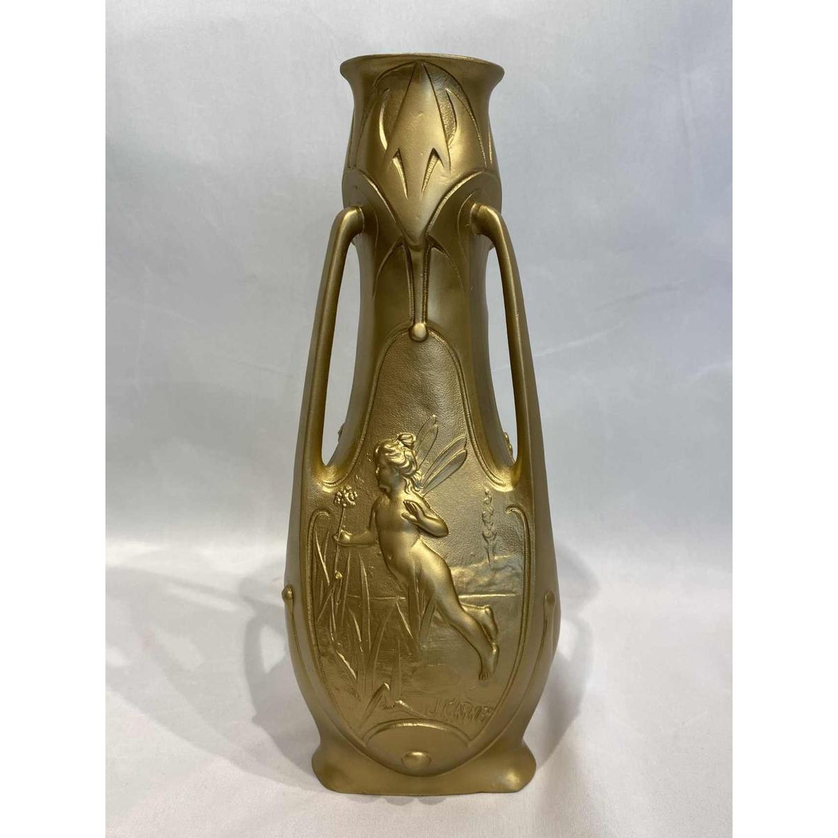 Gilded regula vases, signed Jean Garnier. Pair of Art Nouveau pewter vases with gilded bronze patina, featuring nymphs in low relief on a bucolic background, with 3 detached side handles. Signed Jean Garnier, circa 1900. In very good condition. Height: 31cm Jean Garnier was born in France in 1853 and died around 1910. The artist's works have been sold at public auction 291 times, mainly in the Sculpture-Volume category. The earliest recorded sale took place in 1991 at Sotheby's.