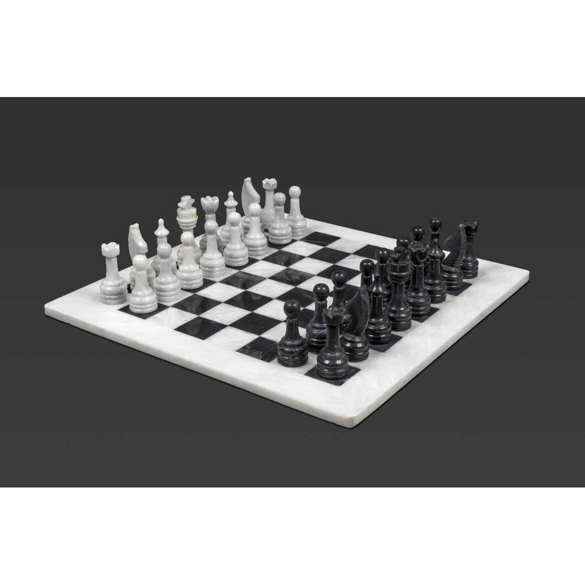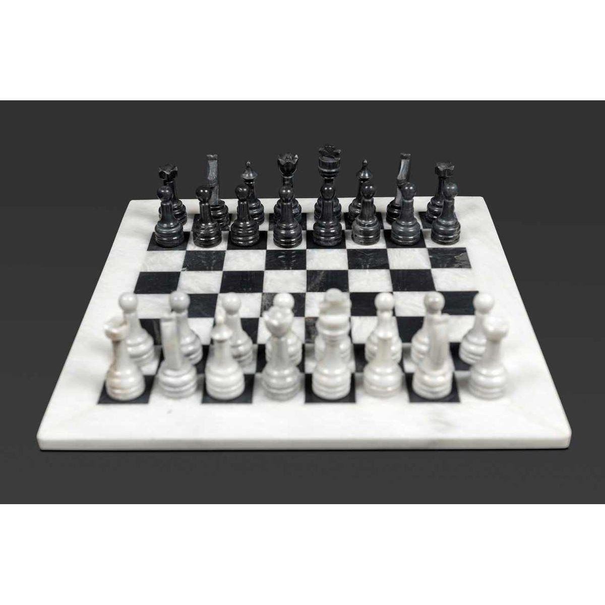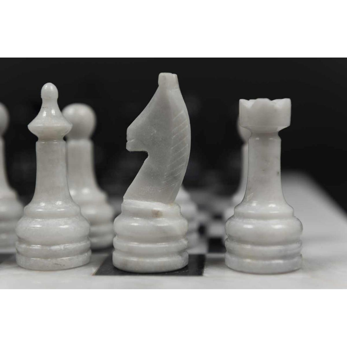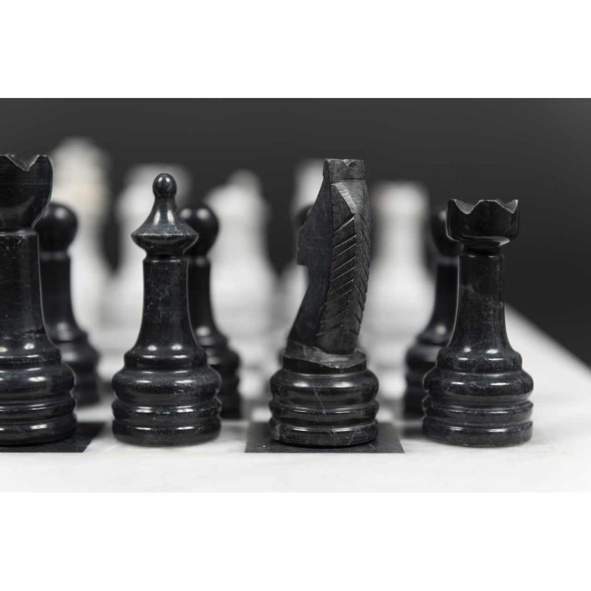 Immerse yourself in absolute refinement with our white and black marble chess set, a masterpiece of sophistication and contemporary elegance. Each piece, finely crafted from marble of immaculate purity, embodies the perfect alliance between timeless luxury and avant-garde design. The striking contrasts between the radiant white and deep black offer a stunning visual aesthetic that is sure to captivate all eyes. Indulge in the smooth and luxurious tactile sensation of marble between your fingers, an exquisite sensory experience that adds an extra dimension to each game. Presented on a matching marble board, this set is more than just a chess game; it is a bold and sophisticated statement of style. Whether you're a seasoned player or a demanding design enthusiast, our white and black marble chess set is the ultimate expression of your impeccable taste and love for luxury. Add a touch of prestige to your living space or collection with this remarkable set, and turn every game into a true social event. With its stunning aesthetic and distinguished allure, this marble chess set is much more than just a game - it's a symbol of your excellence and unparalleled style.